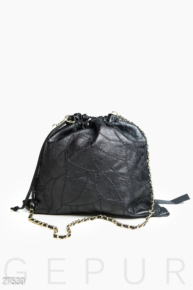 Трендовая женская сумка-мешок, выполненная из мягкой эко-кожи с фигурной строчкой. Сумка дополнена репсовой лентой на лицевой стороне и съемным плечевым ремешком-цепочкой.