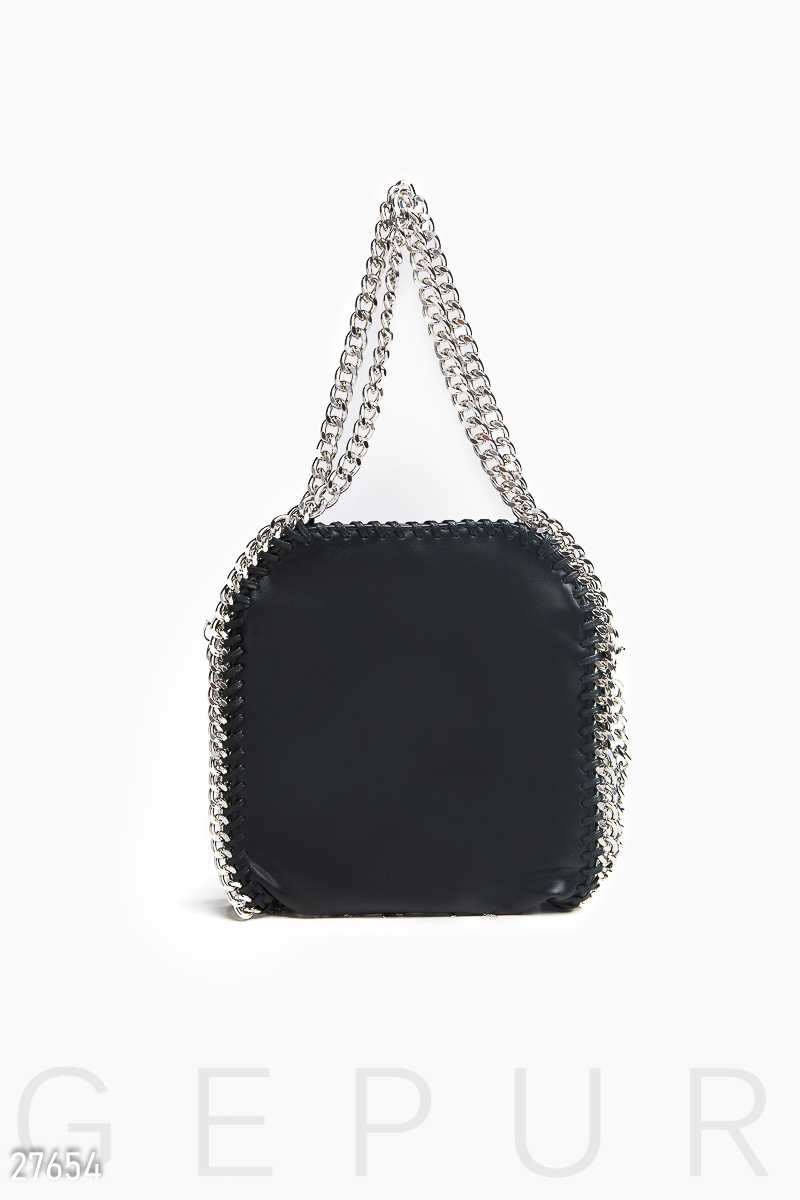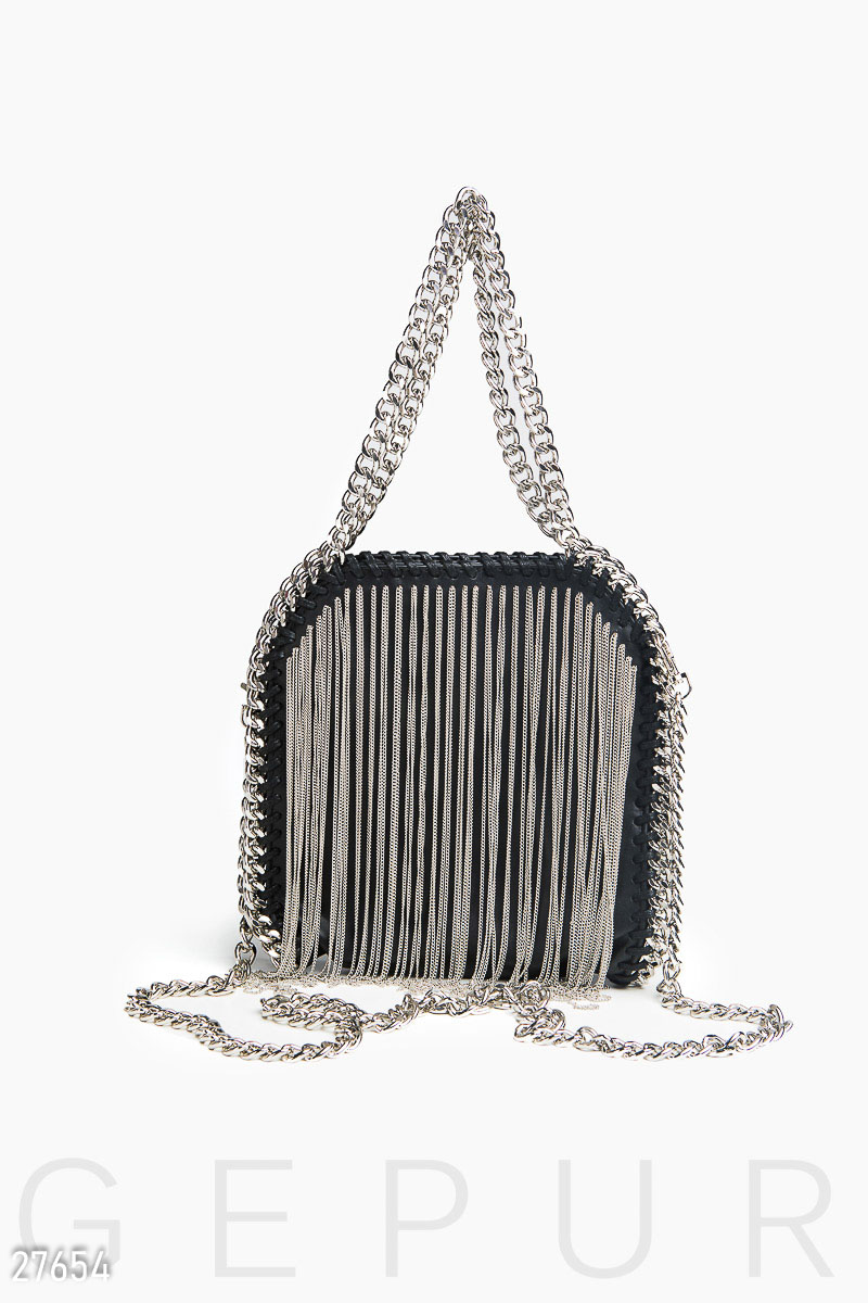 Небольшая женская сумка на плечо, украшенная оригинальным декором: металлическая бахрома и отделка швов металлической цепочкой. Внутри одно отделение и открытый боковой карман.