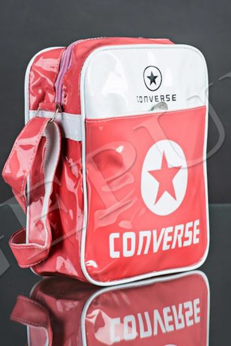 Сумка Converse почтальонка, длинная ручка, одно отделение и кармашек спереди., Материал: лак, Цвет: белый персиковый Размеры: В-26см,Ш-21см. Высота ручек -73см