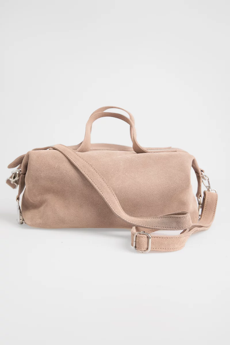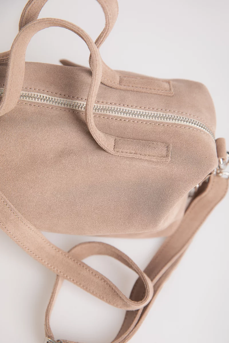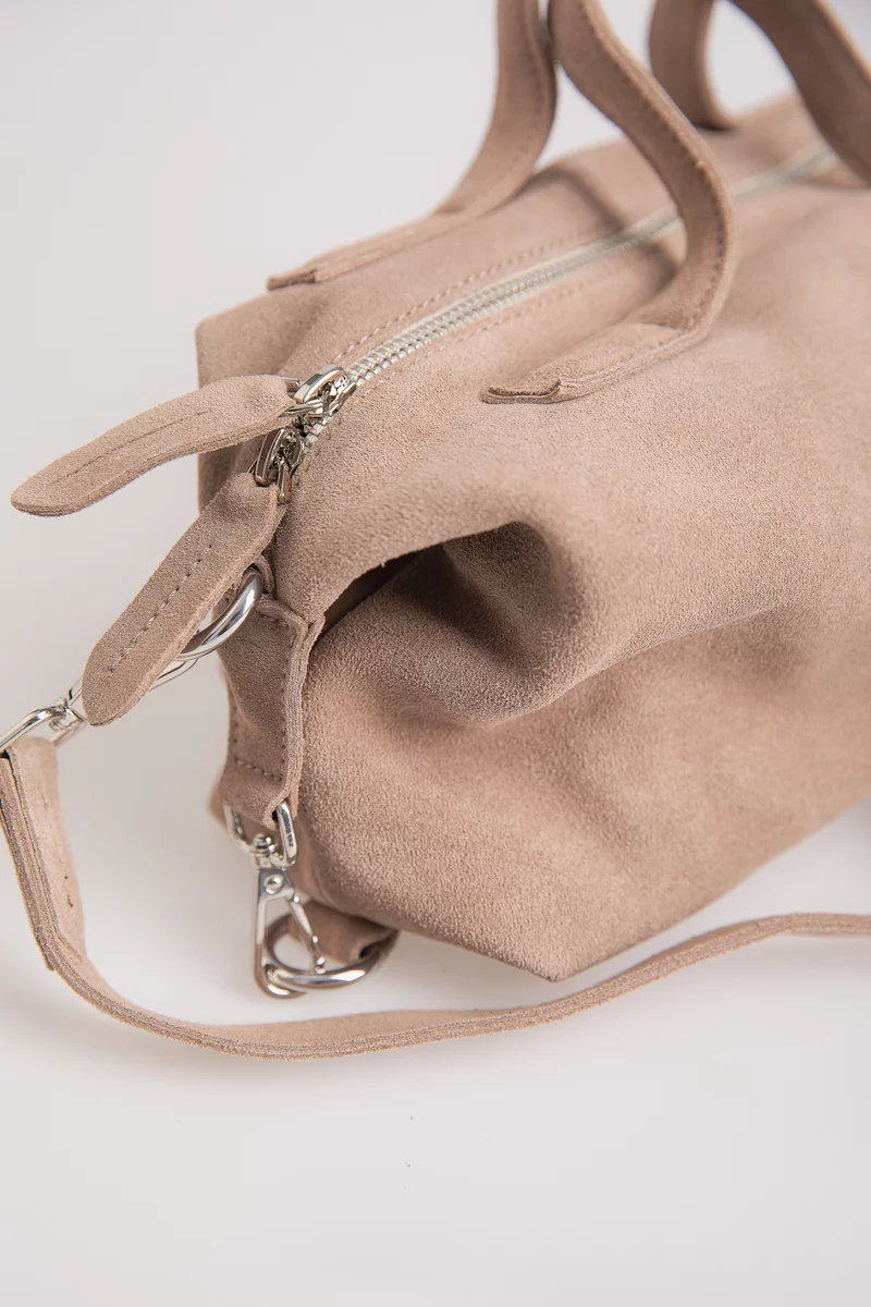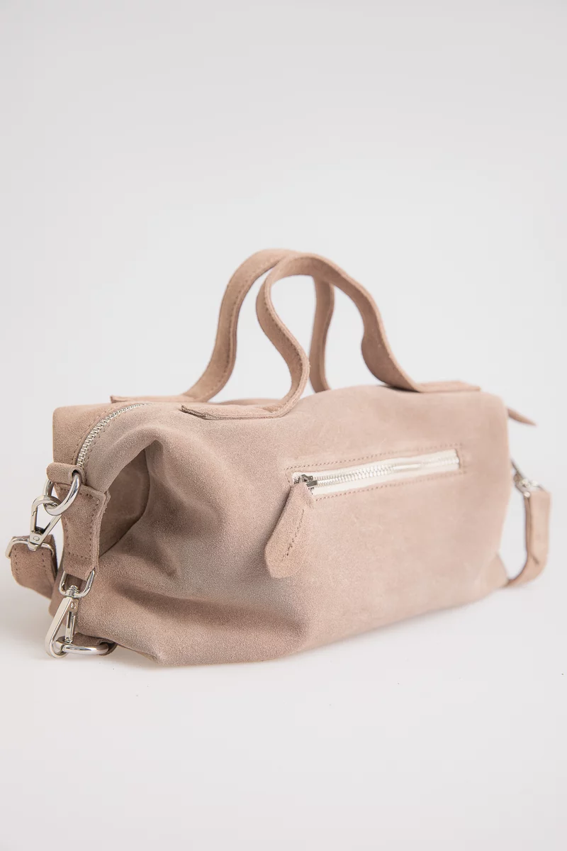 Сумка из натуральной замши с двумя короткими ручками и съемным ремнем. Одно объемное отделение застегивается на молнию, есть два внутренних кармана. На подкладке. Ширина 11 см, длина 29 см, высота 16 см
