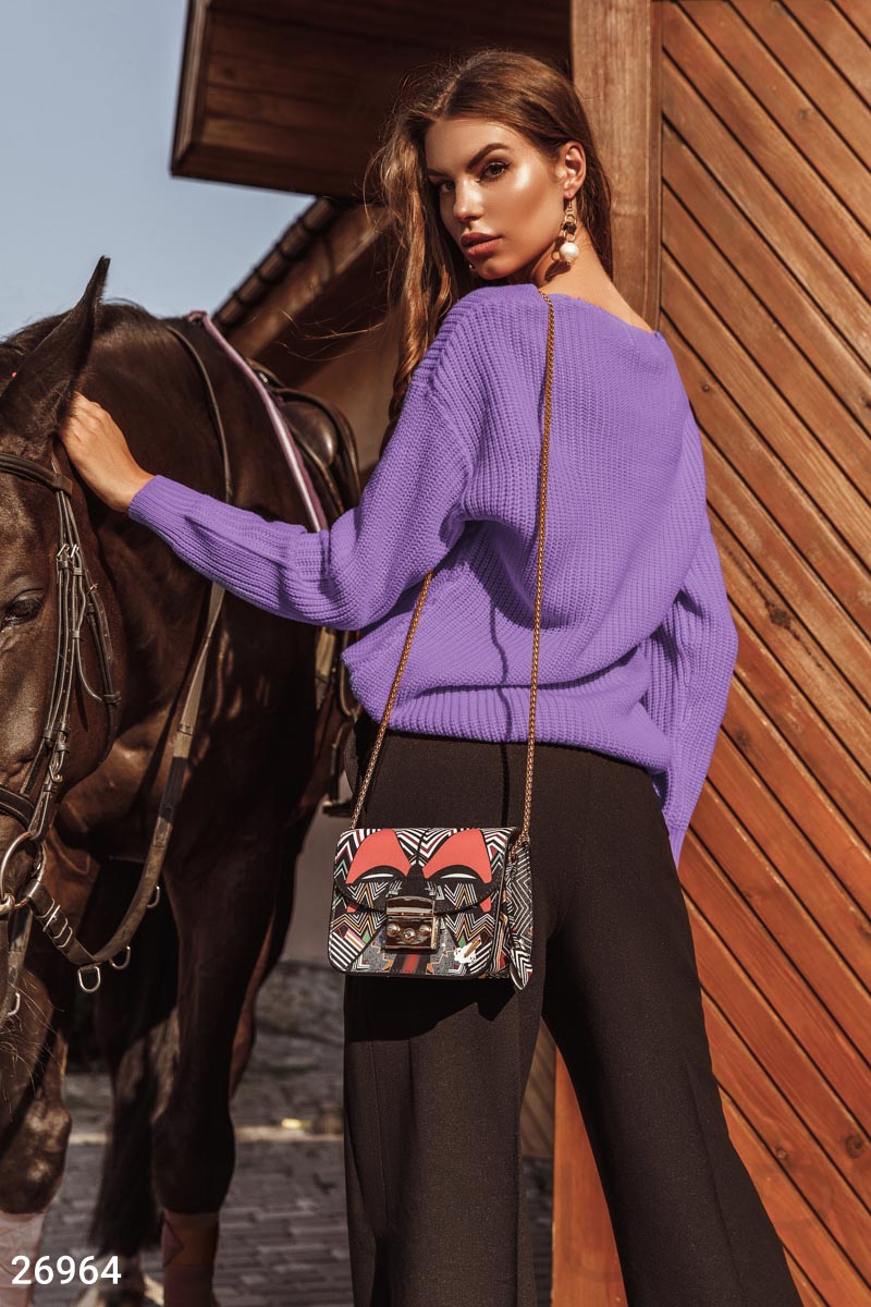 Комфортный пуловер лавандового оттенка из мягкой пряжи, с заниженной линией плеча, длинным рукавом на эластичной манжете и удлиненной спинкой.