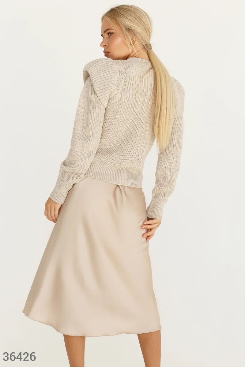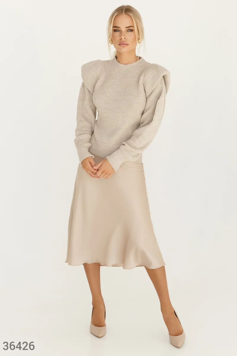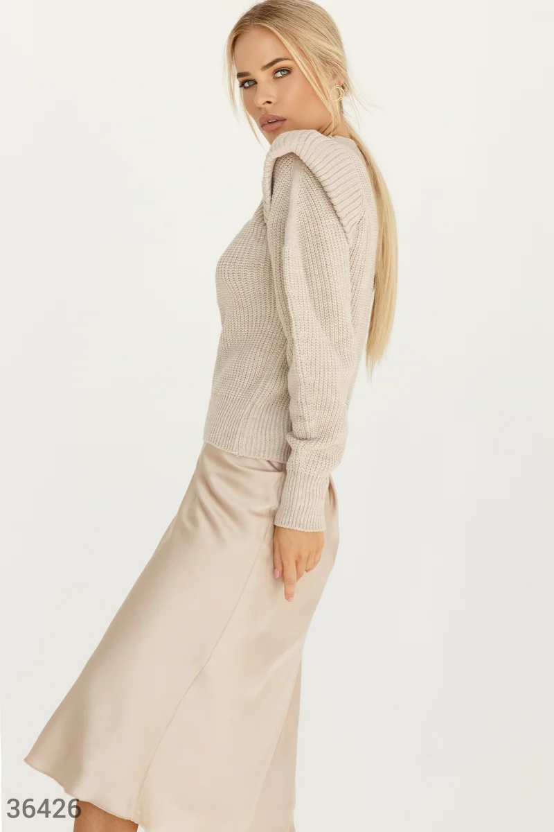Бежевый свитер с вязанным узором. Главная особенность модели состоит в трендовых декоративных вставках на плечах, ставящих акцент на верхней части силуэта. Оригинальный фасон рукавов дополнен эластичной манжетой.