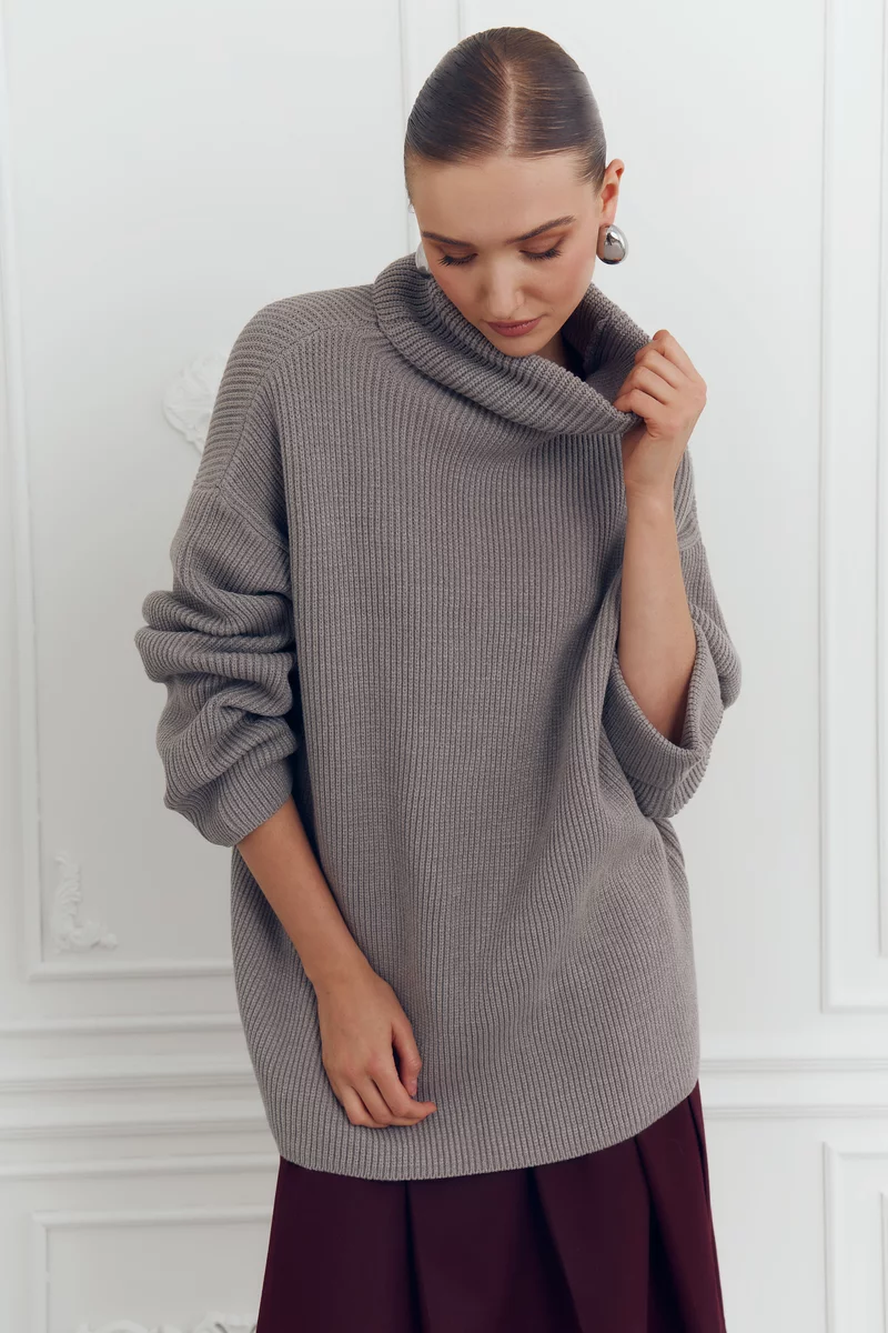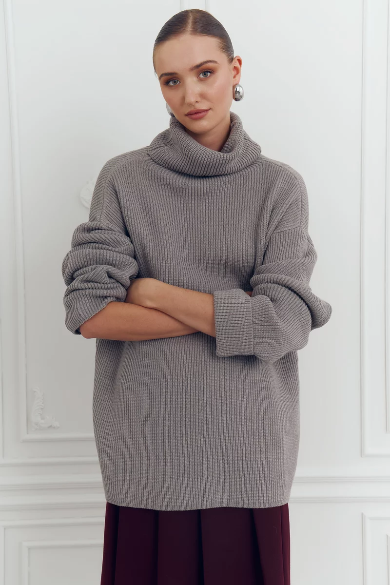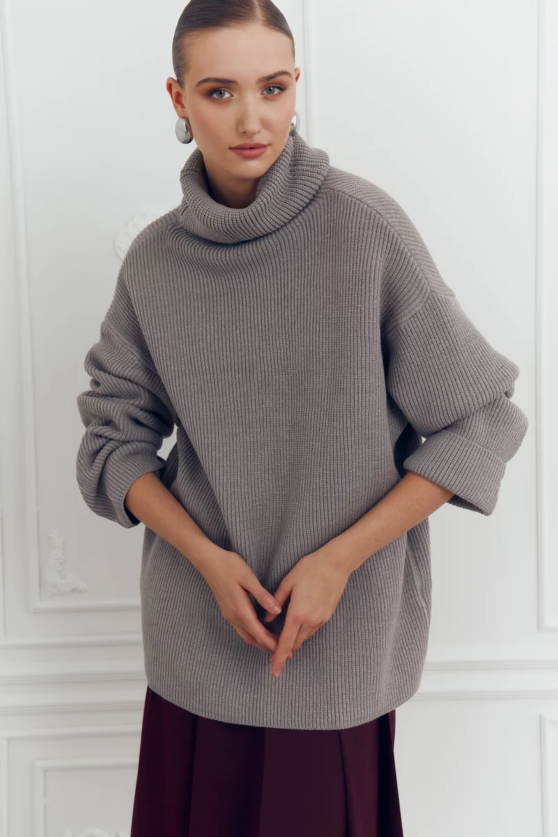 Удлиненный базовый свитер оверсайз с воротником-стойкой. Модель стилизована заниженной линией плеча и прямым широким рукавом с отворотом. Храни в сложенном виде, чтобы избежать вытяжки