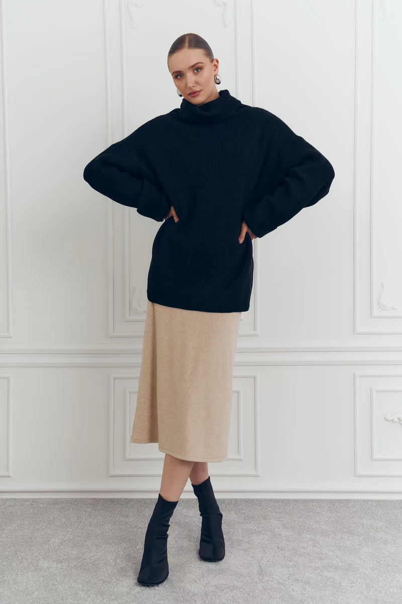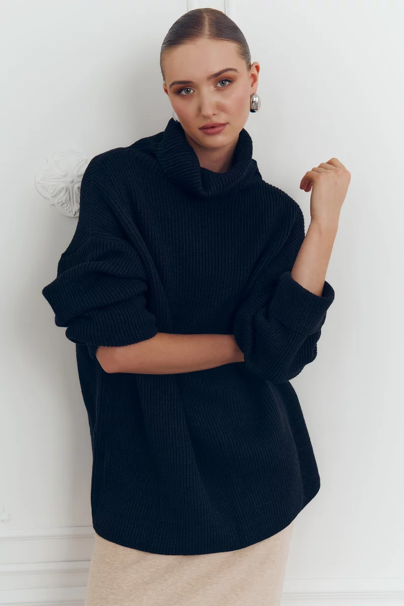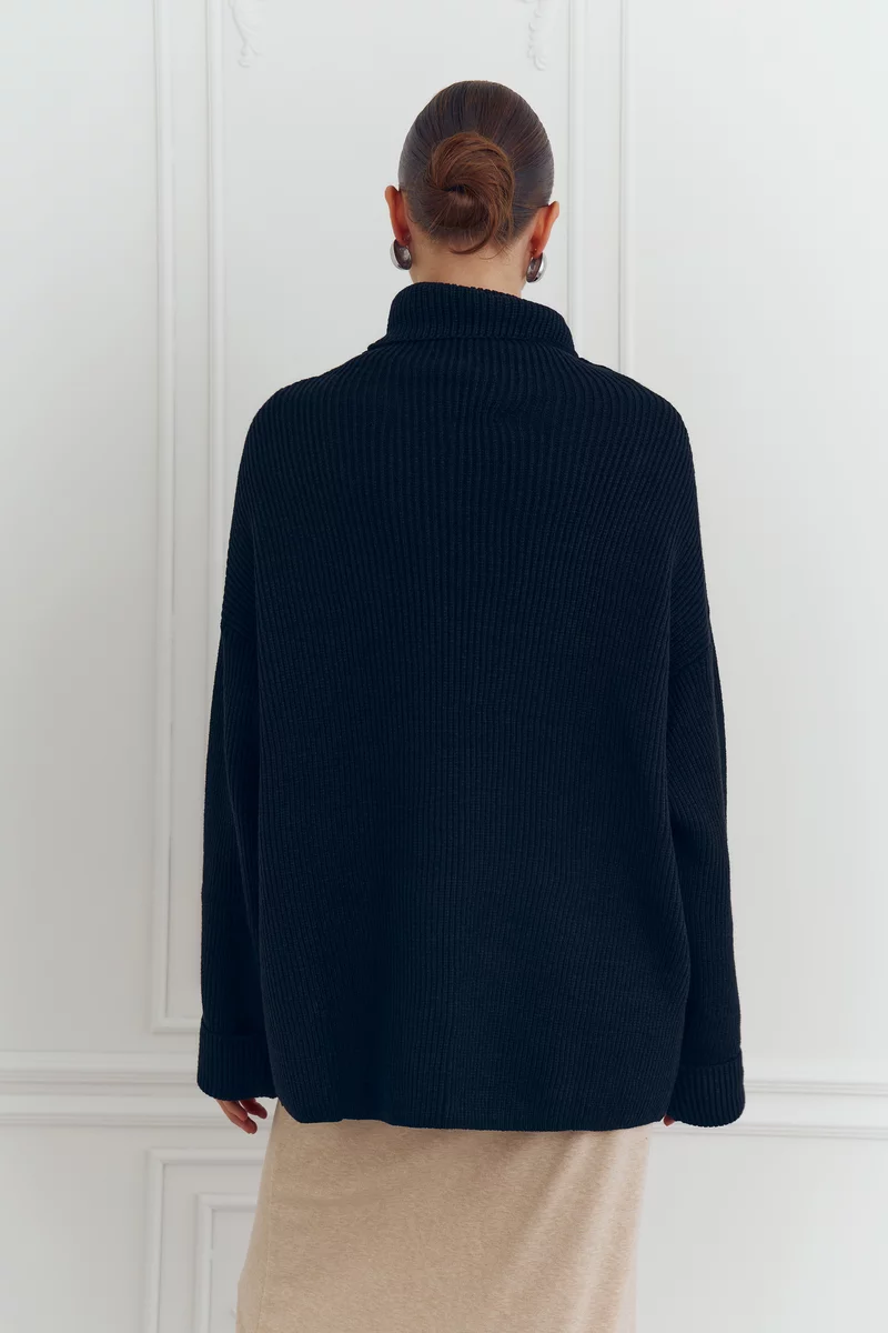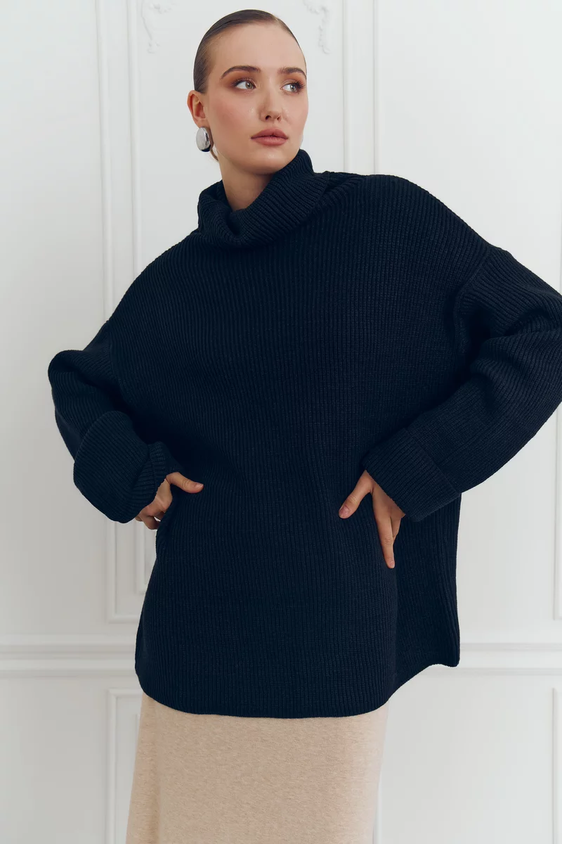 Удлиненный базовый свитер оверсайз с воротником-стойкой. Модель стилизована заниженной линией плеча и прямым широким рукавом с отворотом. Храни в сложенном виде, чтобы избежать вытяжки