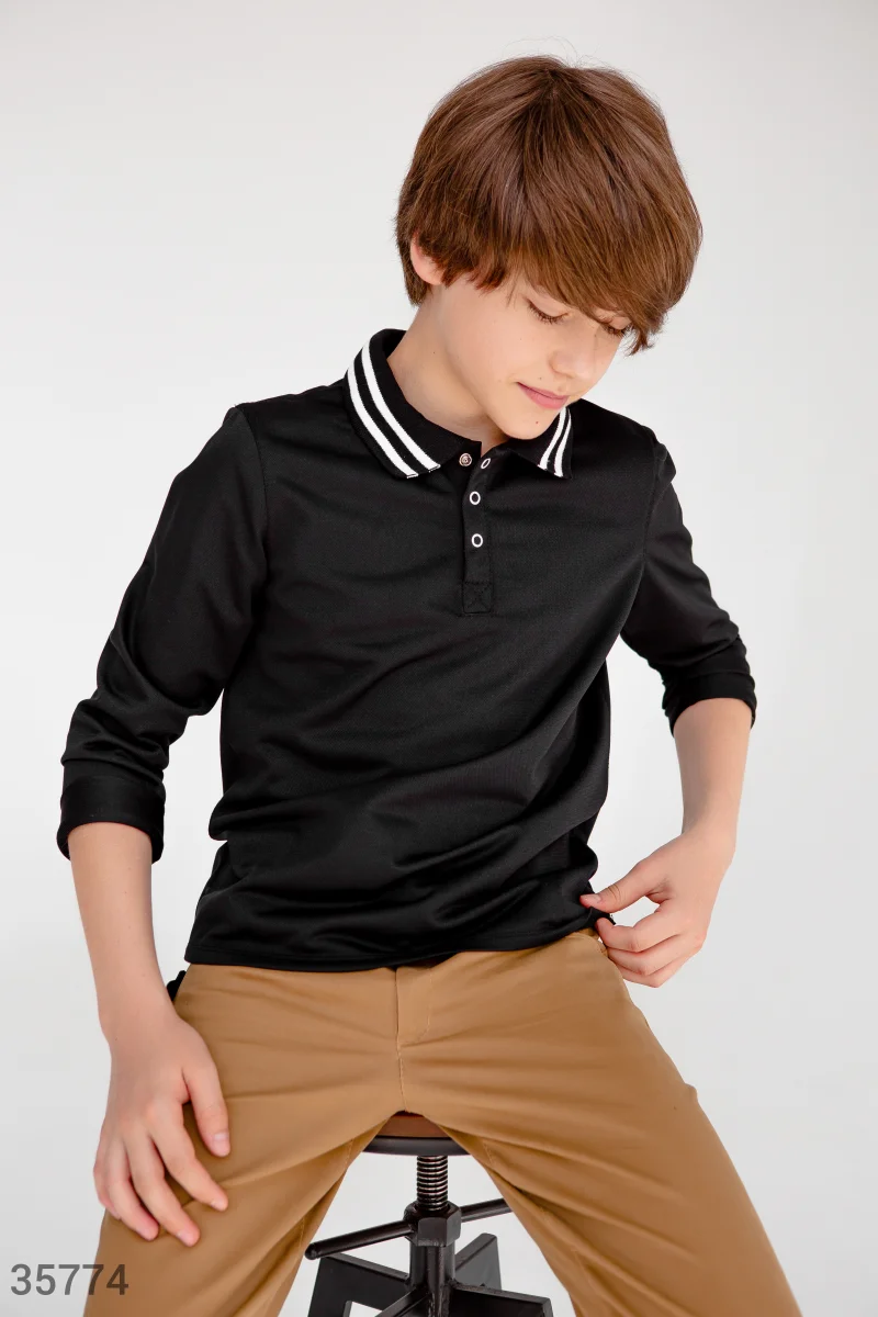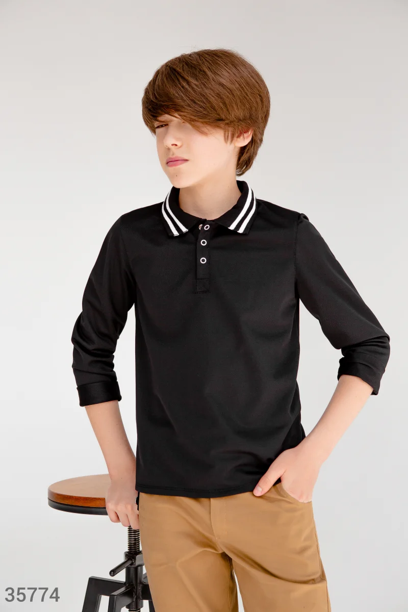 Строгая черная рубашка с длинным рукавом и классическим отложным воротником-поло в контрастную полоску. Планка с кнопками до груди, свободный крой.