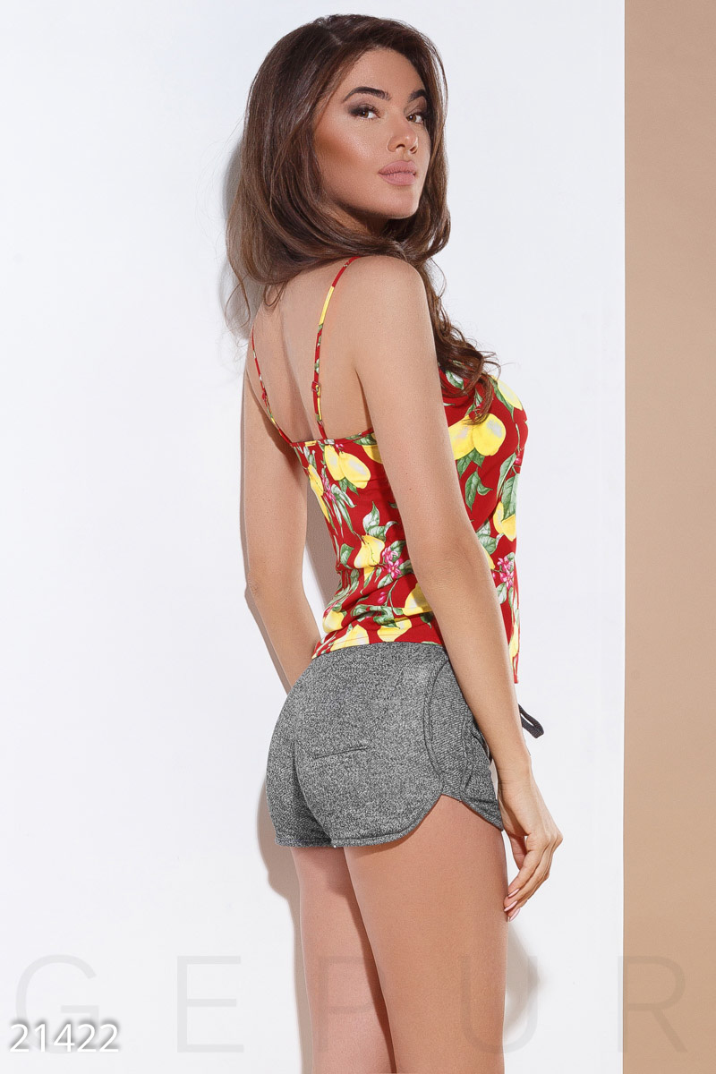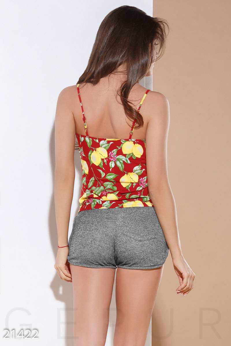 Изящный топ в бельевом стиле, выполненный из шифона с фруктовым принтом: тонкие регулируемые бретели и аккуратный v-образный вырез спереди, украшенный воздушным кружевом.