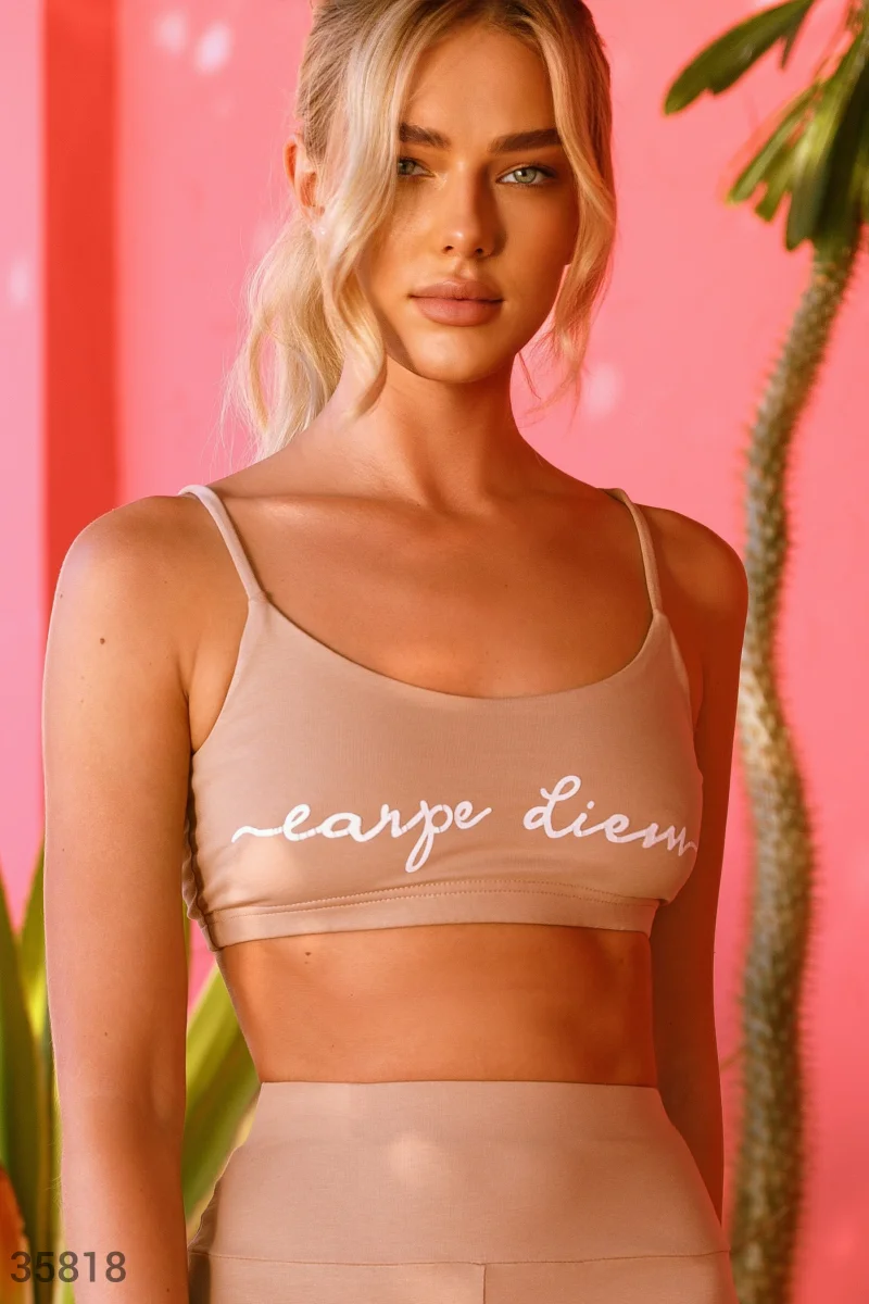 Лаконичный короткий топ бежевого цвета на тонких нерегулируемых бретелях. Модель дополнена контрастным принтом «Capre Diem».