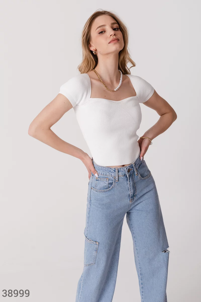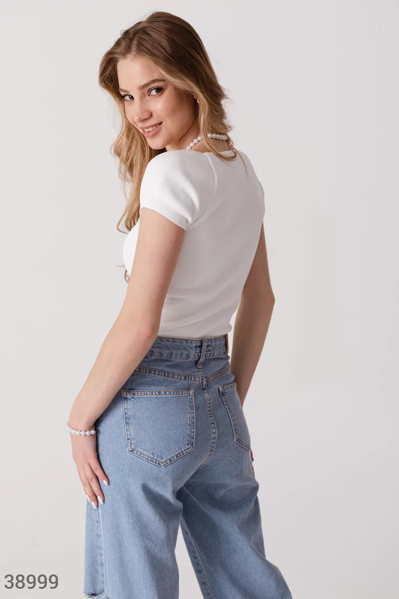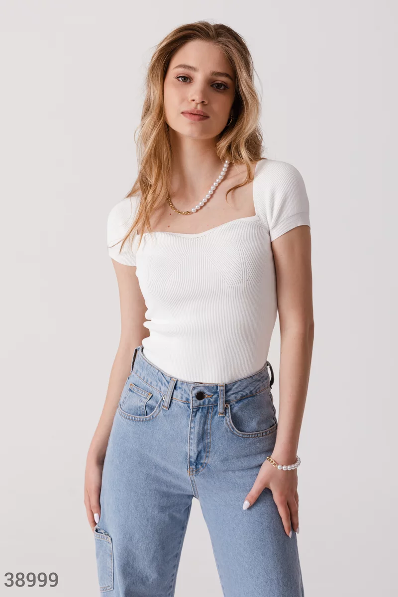 Летний топ базового цвета, выполненный из мягкого трикотажного полотна. Аккуратный квадратный вырез и короткий облегающий рукав, который подчеркивает линию плеч.