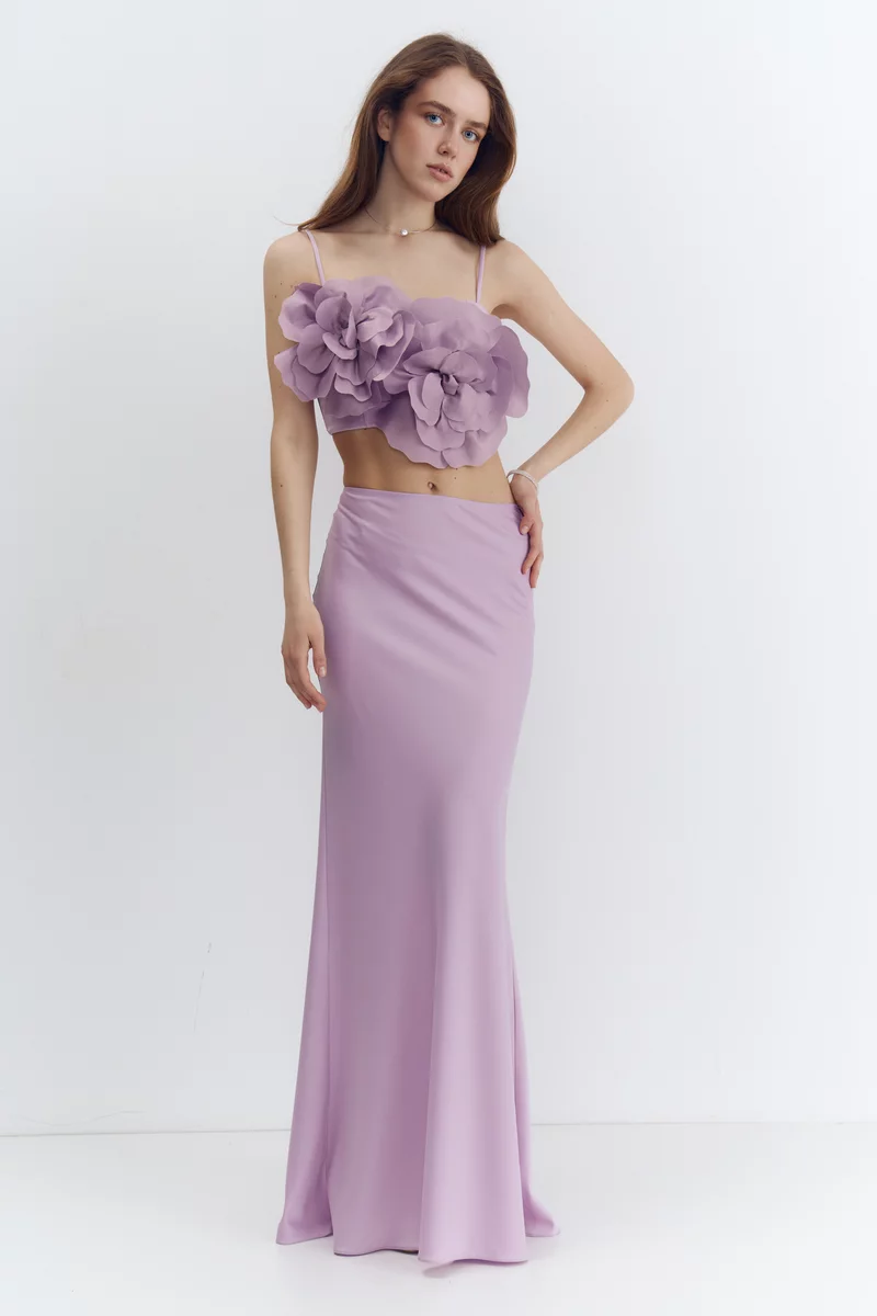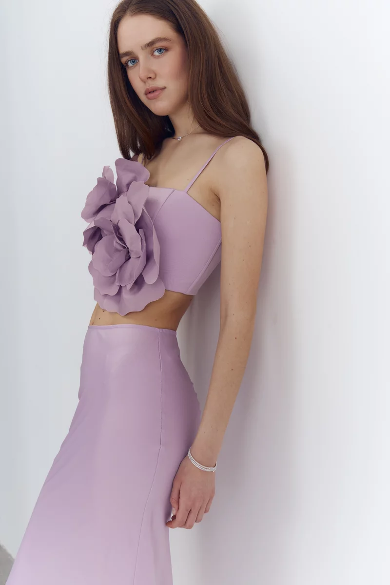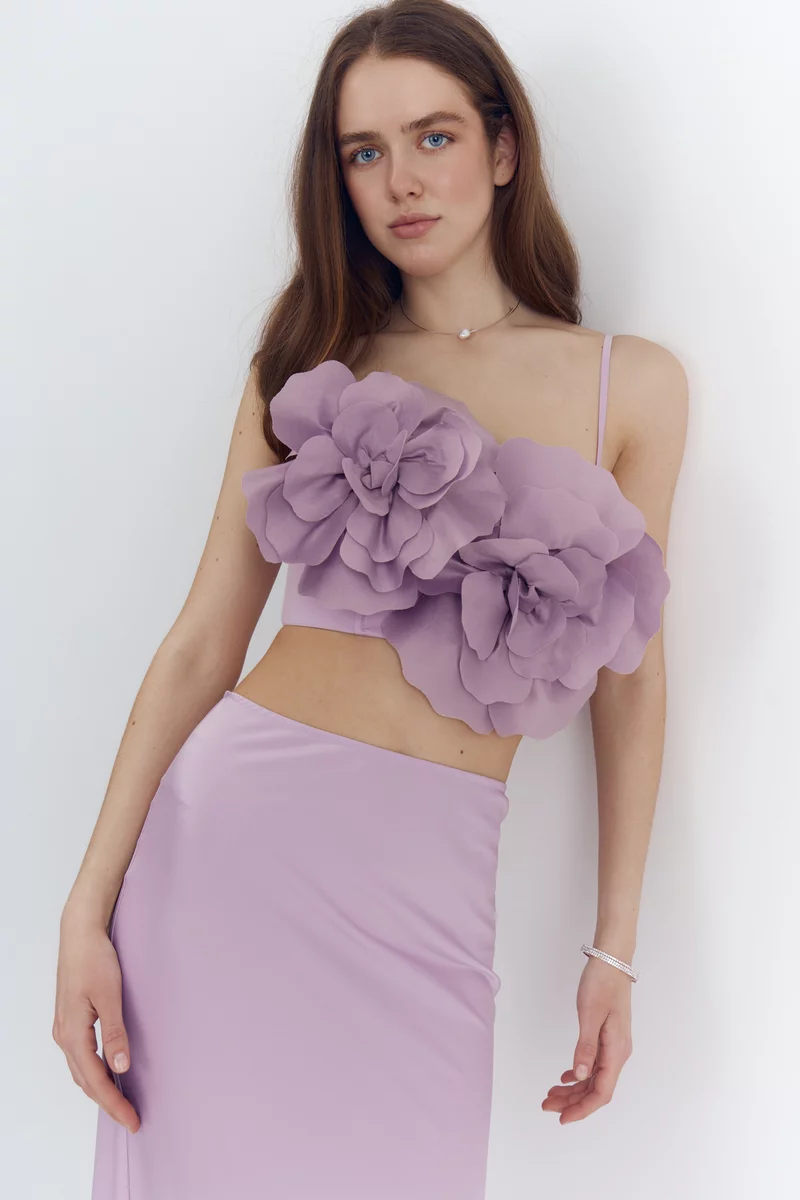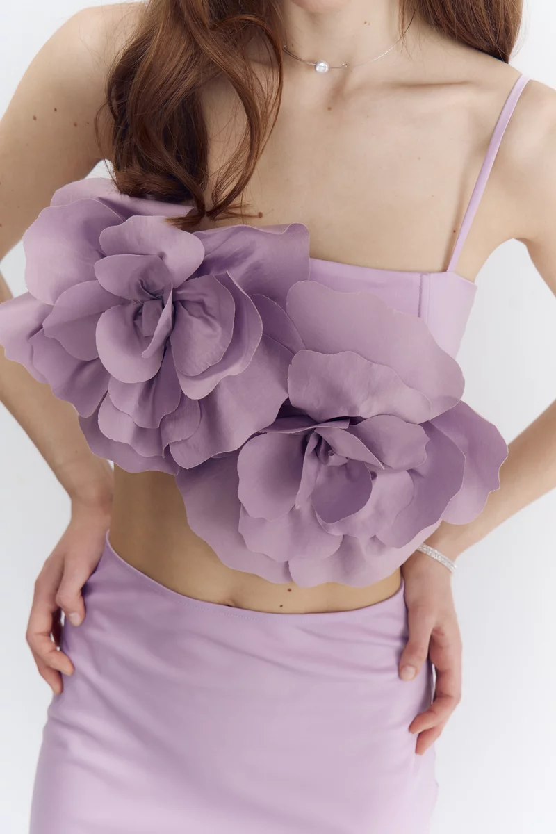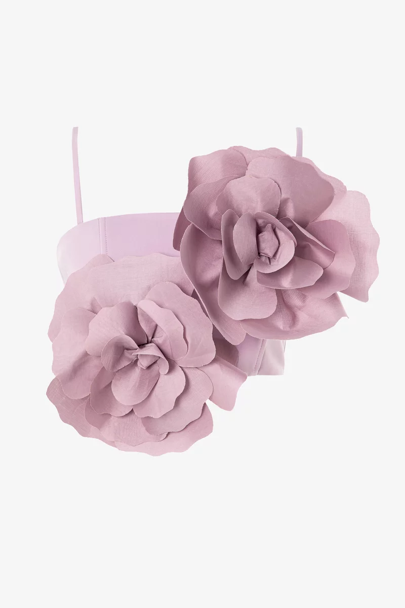 Топ из гладкого и сияющего сатина, который как лепесток камелии идеально отражает свет и нежно скользит по телу, повторяя каждое твое движение с безупречной грацией. Модель с акцентными съемными цветами. Тонкие регулируемые бретели позволяют сделать идеальную посадку. Топ застегивается на крючки сзади. На подкладке