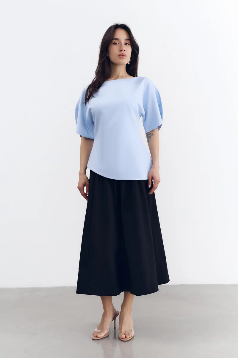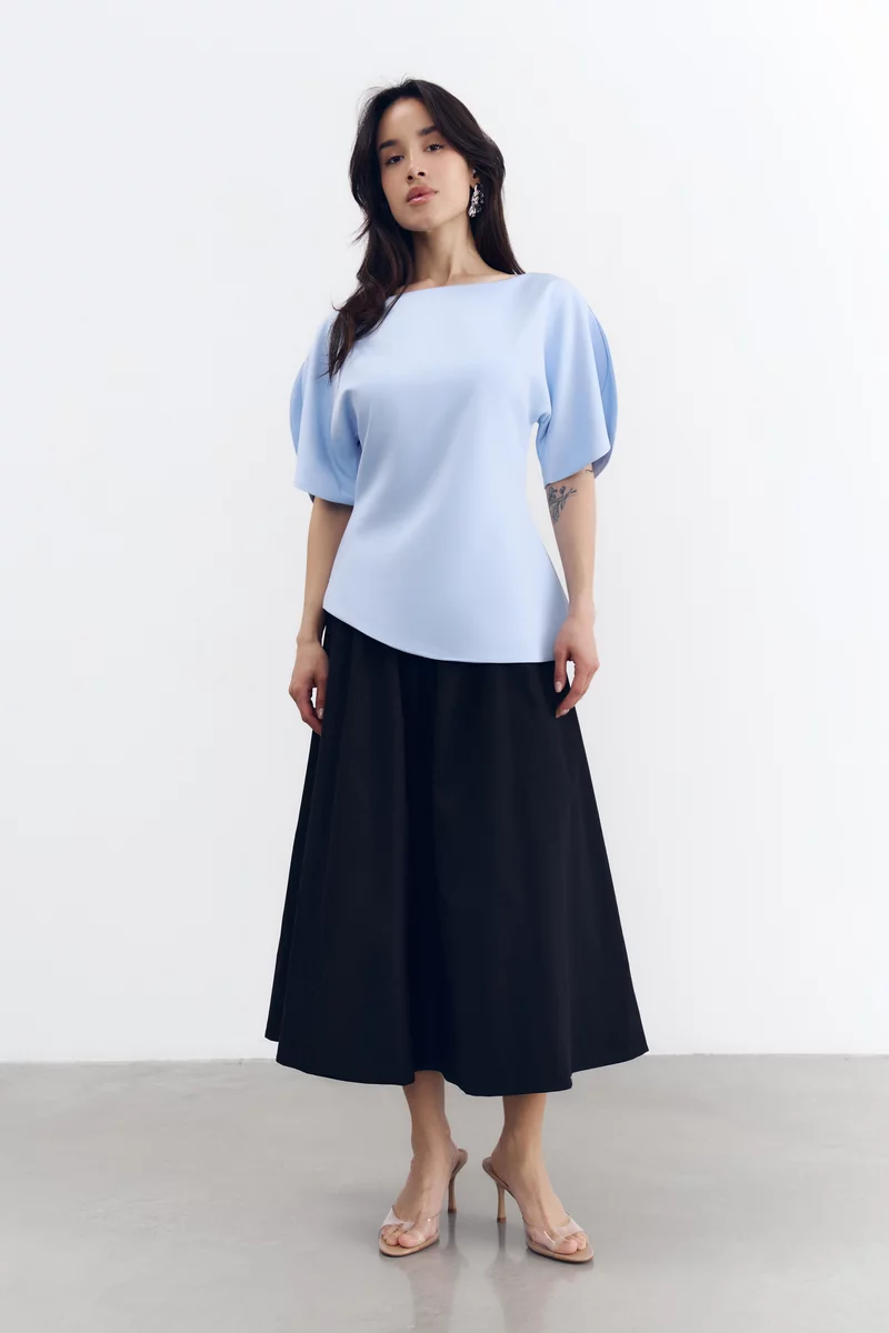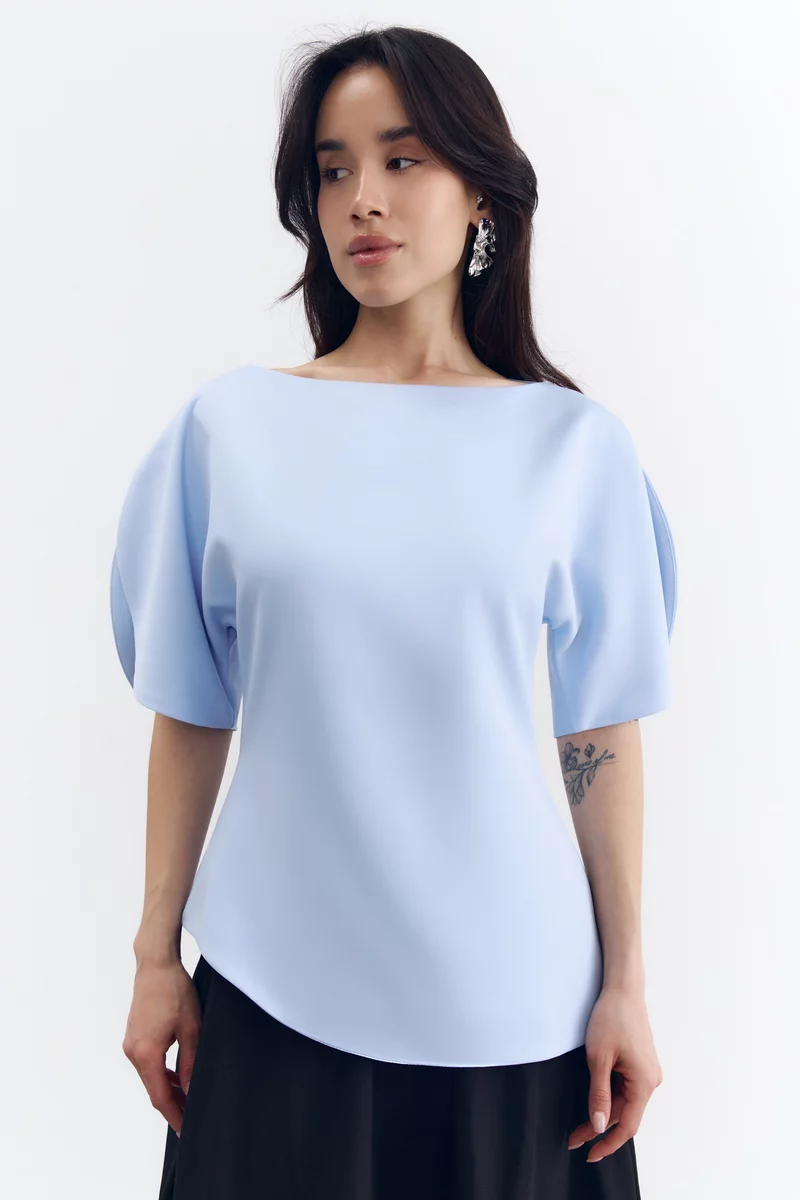 Голубой топ с акцентными объемными рукавами и разрезами