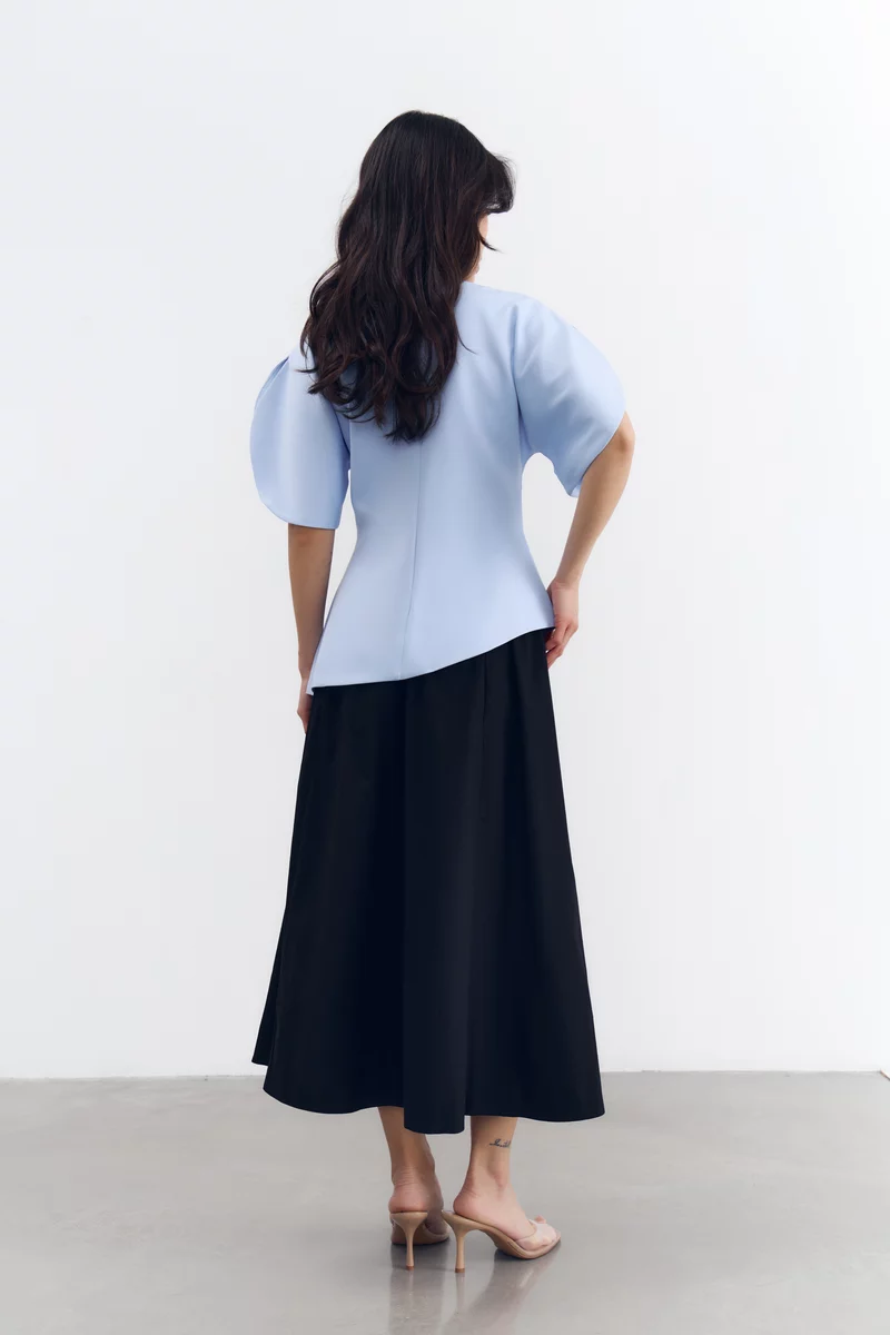 Топ асимметричного кроя из костюмной ткани. Акцентная деталь – объемные рукава с разрезами. Застёгивается на скрытую молнию на спине
