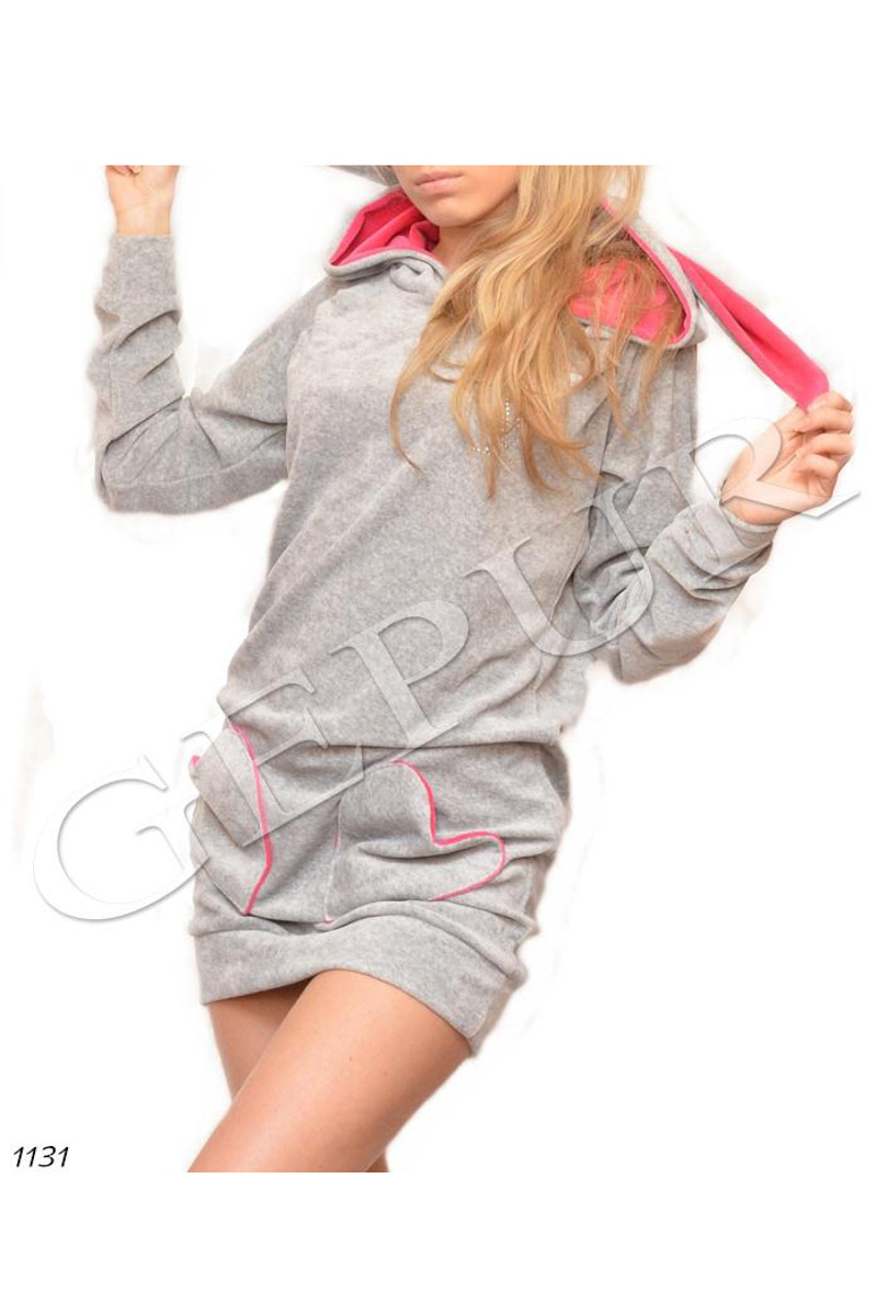 Комфортная женская туника, выполненная из мягкого велюра: объемный капюшон с ушками, длинный рукав с манжетой и два накладных кармана в форме сердечек. . .