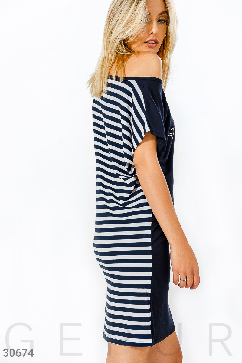 Пляжная туника свободного кроя с аккуратным круглым вырезом, цельнокроеным рукавом, спинка украшена полосатым принтом, передняя часть - декоративными камнями.