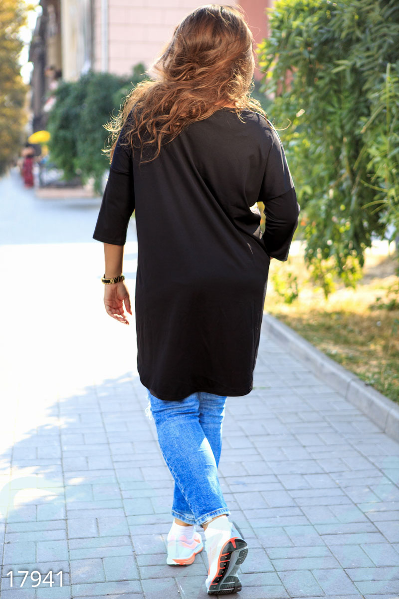 Любите цветы? Тогда эта туника придется вам по вкусу! Украшенная оригинальным принтом, эта модель напоминает цветочную поляну, на которой расцвела одна большая роза. Ну а какая девушка не мечтает о цветах? Среди главных особенностей батальной модели: асимметричный крой с удлиненной спинкой, косой передний подол и низкий шов проймы.