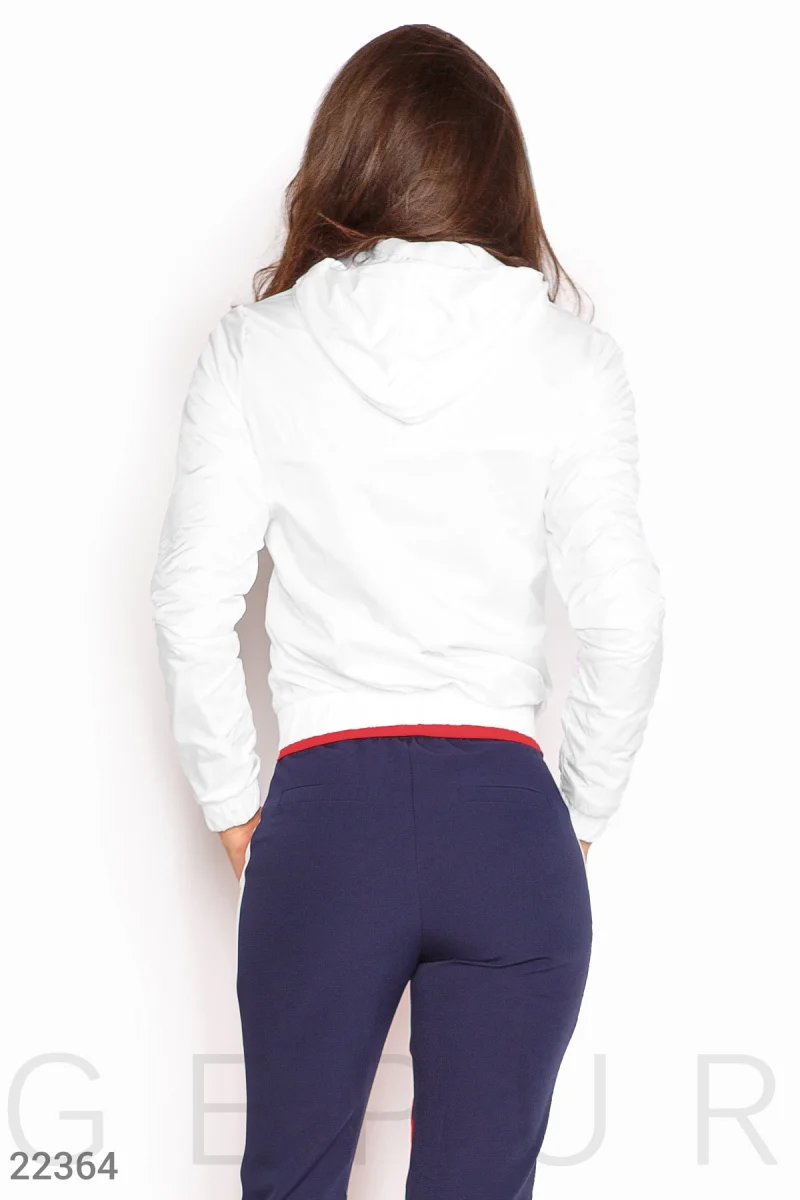 Хорошая ветровочка, стильная. Цвет белоснежный с черными и красными полосами. Изнутри на флисе. На рост 175 не короткие рукава. На параметры 89-68 брали М.