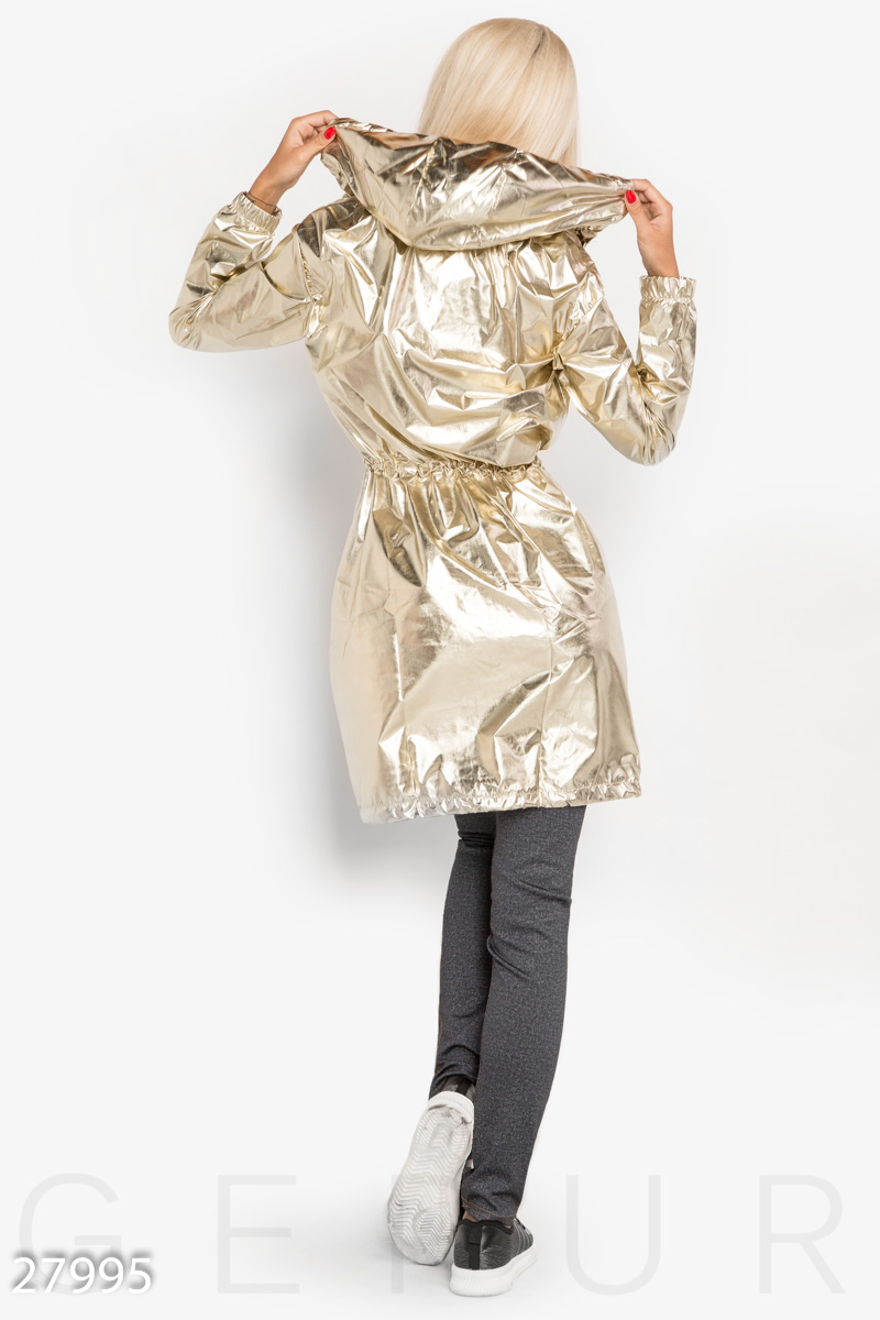 Удлиненная ветровка из плащевой ткани с напылением: пришивной капюшон с завязками, два накладных кармана с клапаном и втачной пояс с завязками на кулиске. .