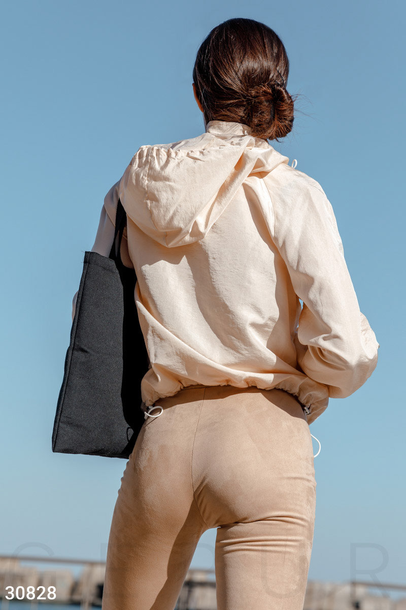 Однотонная укороченная ветровка свободного кроя, выполненная из легкой водоотталкивающей ткани, от дизайнеров Gepur: отложной воротник, объемные длинные рукава, на капюшоне, манжете и талии затягивающиеся шнурки, два вместительных кармана в швах по бокам. . ,