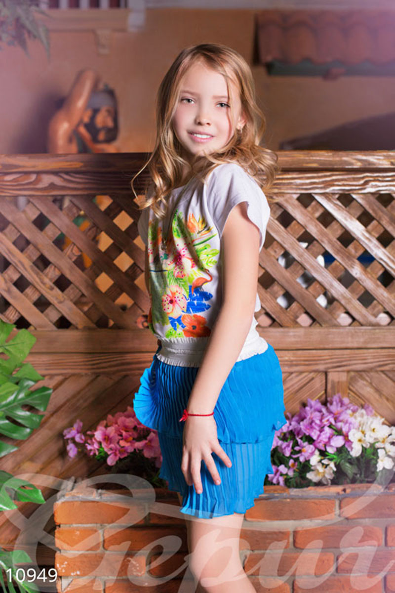 Многоярусная детская юбка-плиссе с широким эластичным поясом, выполненная из воздушного крепдешина.