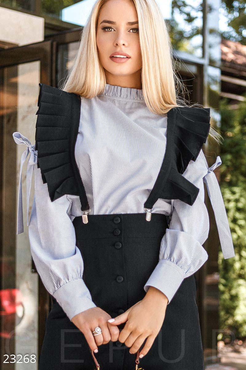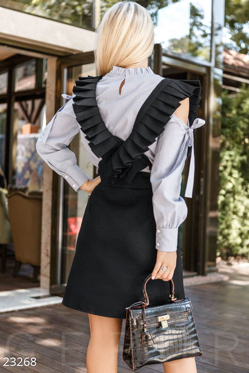 Аккуратная офисная юбка-трапеция, дополненная съемными широкими подтяжками с рюшами.