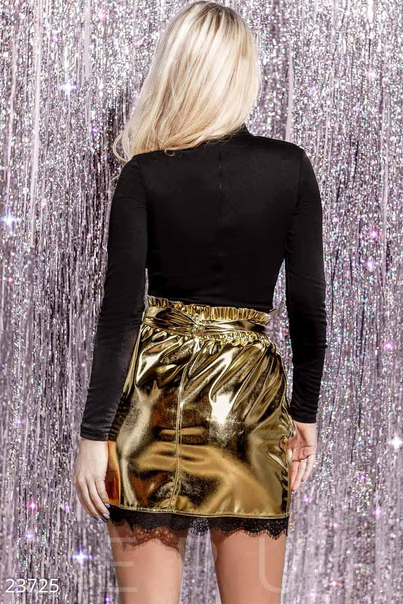 Авторская юбка от дизайнеров Gepur, выполненная из эко-кожи с напылением: эффектный пояс с защипами, пояс-завязки в петлях, два прорезных кармана по бокам и кружевная отделка подола.