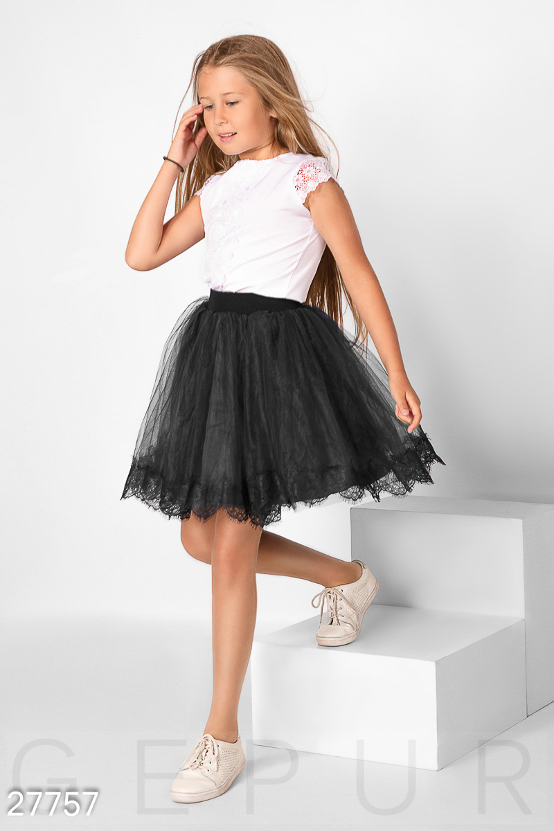 Пышная детская юбка из фатина с эластичным поясом и кружевной отделкой подола.