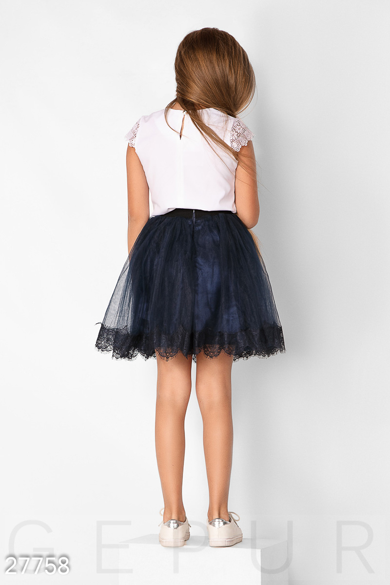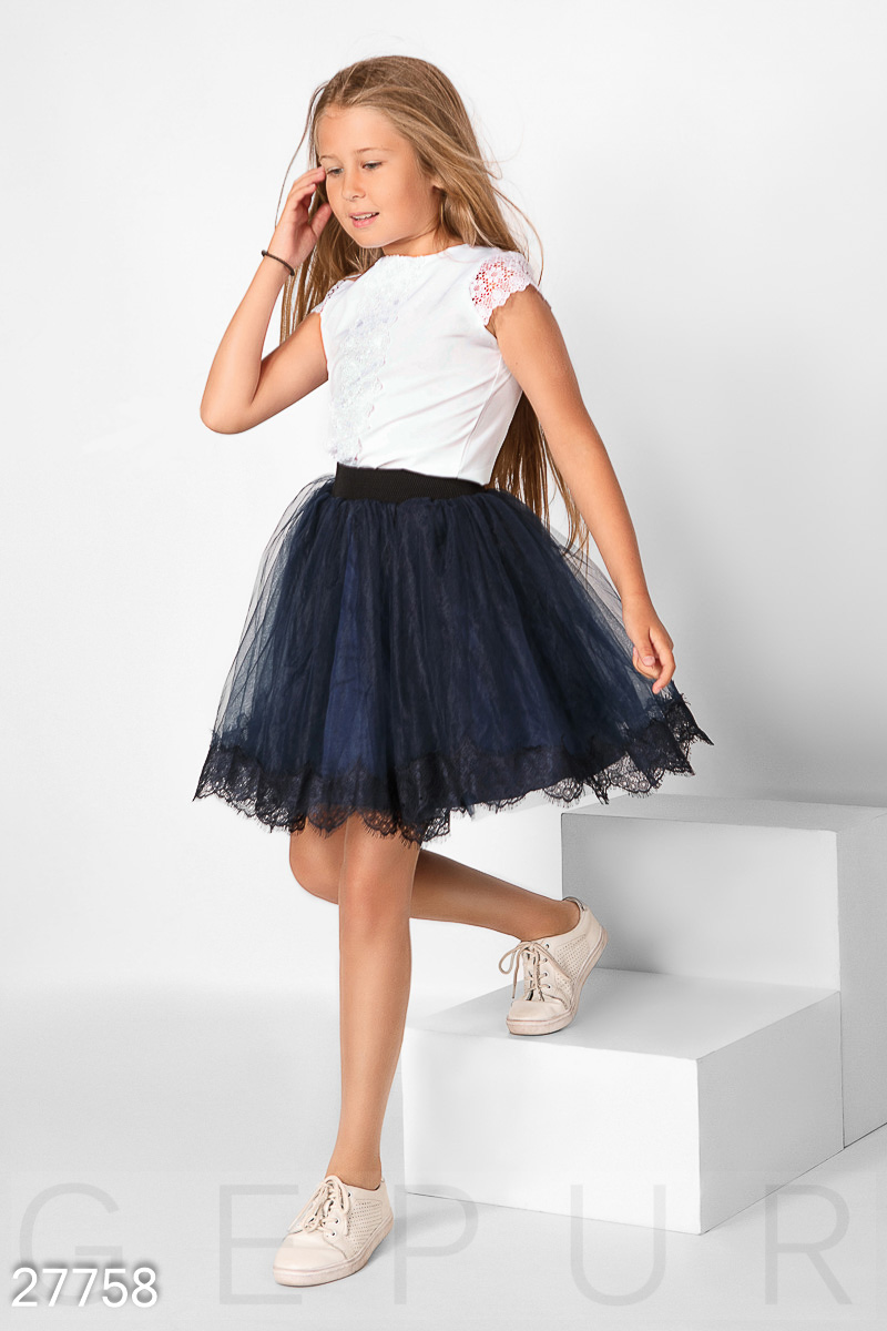 Пышная детская юбка из фатина с эластичным поясом и кружевной отделкой подола.
