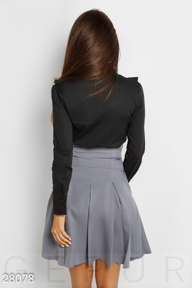 Расклешенная юбка с высокой посадкой, аккуратными складками, двумя карманами в швах и небольшим фигурным вырезом по линии пояса.