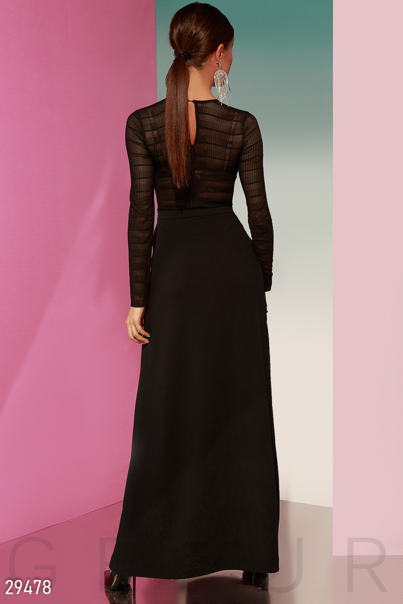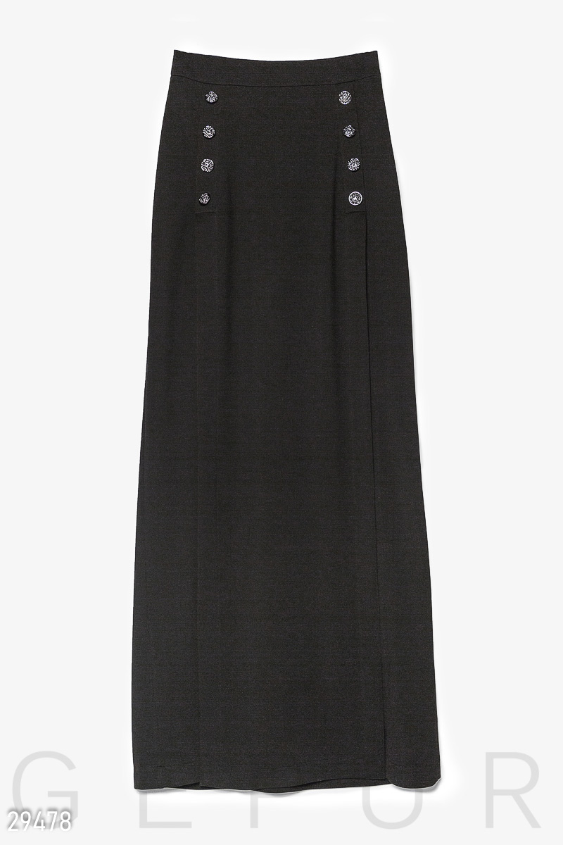 Эффектная юбка-макси, выполненная из мягкой ткани, от дизайнеров Gepur: А-силуэт, завышенная линия талии, декоративные пуговицы по бокам и высокие разрезы.
