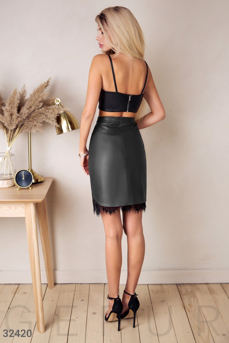 Оригинальная юбка-мини из эко-кожи серого цвета, созданная дизайнерами Gepur: высокая посадка и асимметричный боковой разрез, украшенный пуговицами и кружевом. Лицо коллекции: Анна Романова - популярный Instagram-блоггер и it-girl. ...