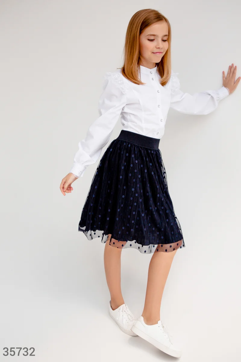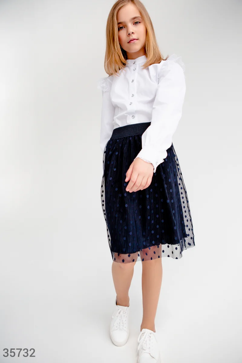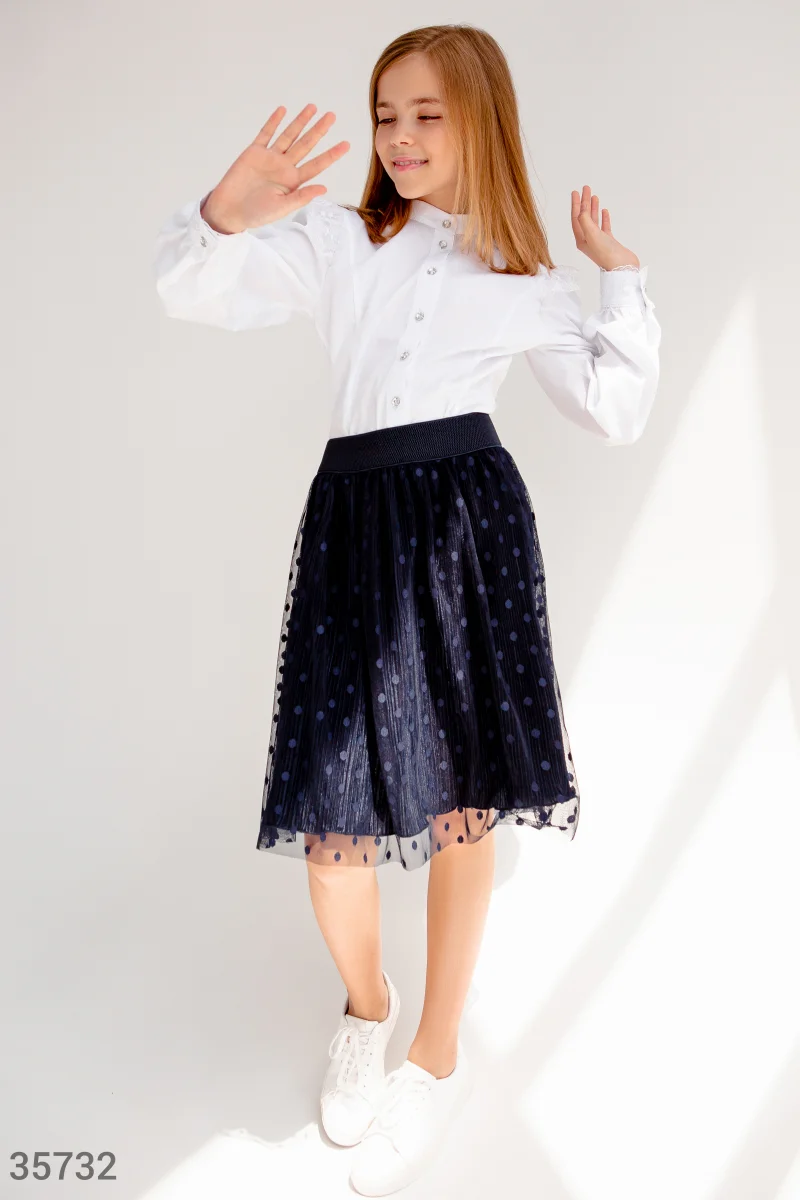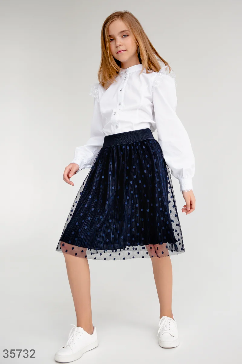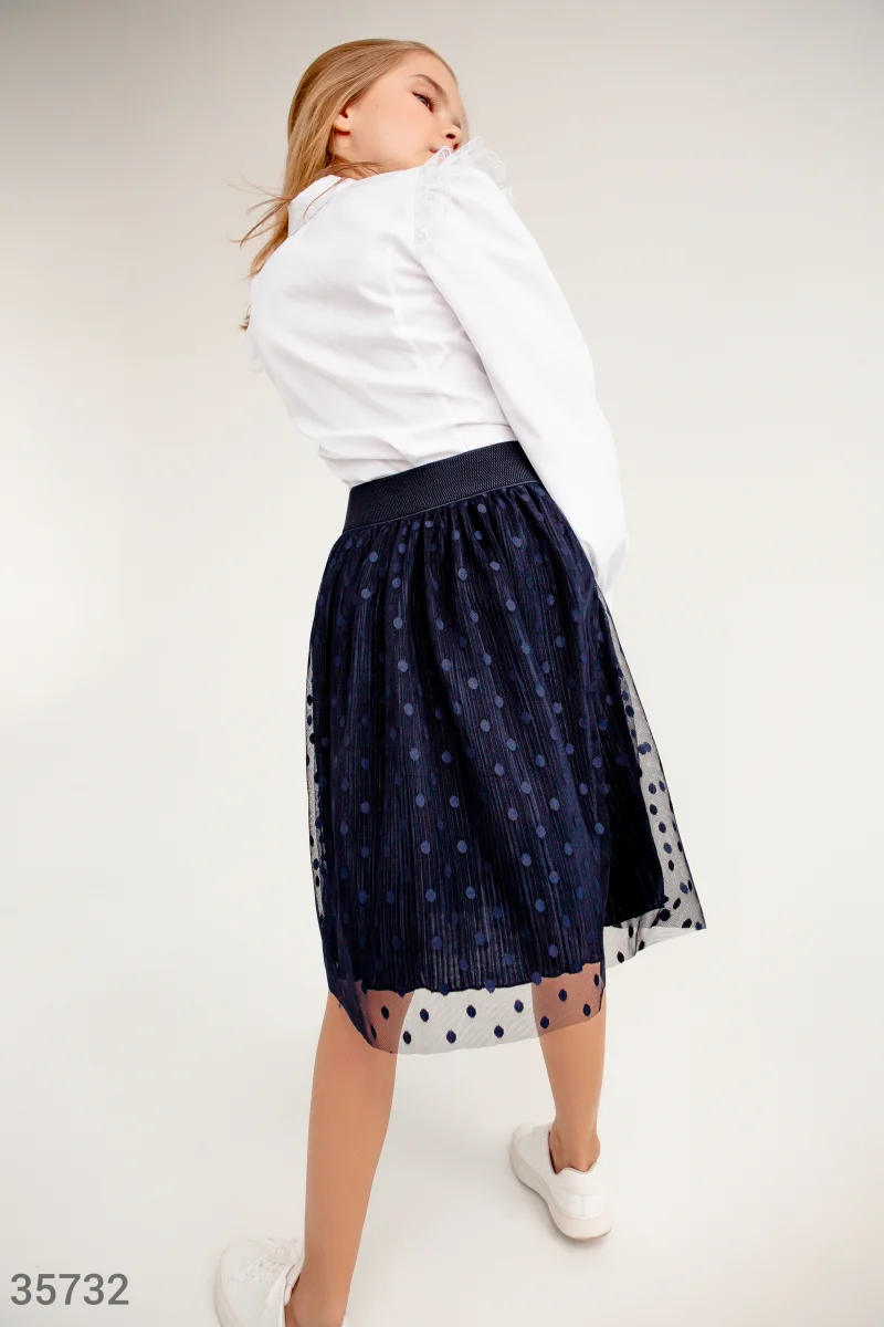 Воздушная расклешенная юбка из темно-синего фатина с эластичным поясом для комфортной повседневной носки. Модель дополнена флоковым напылением в виде мелкого горошка, что добавляет образу легкости и праздничного настроения.