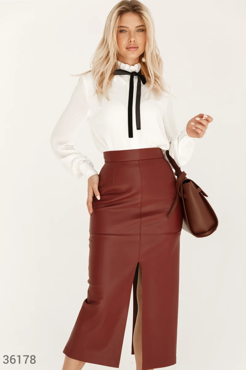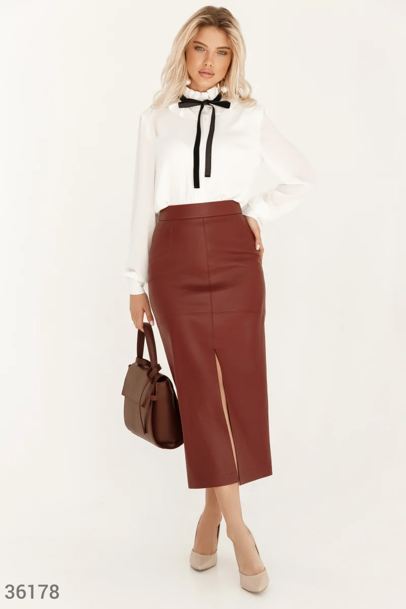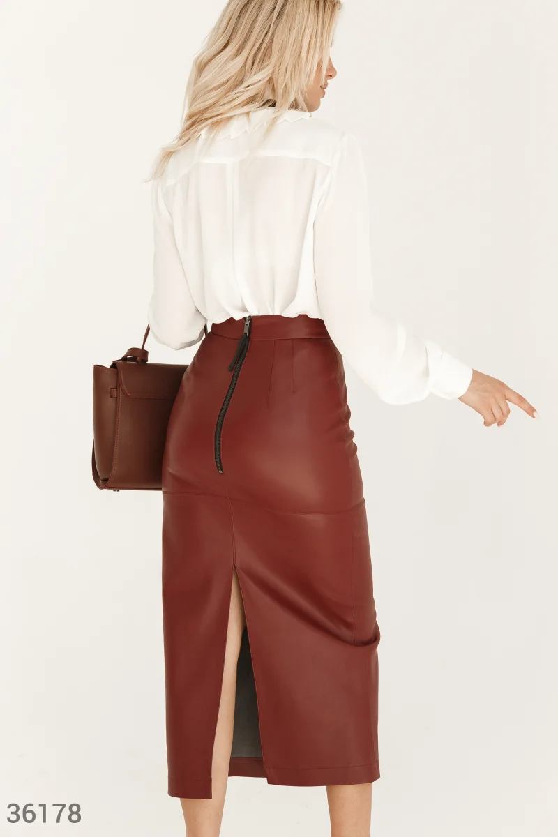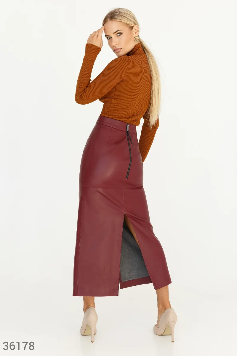Кожаная юбка оттенка марсала позволяет привлечь внимание в осеннем сезоне. С этой задачей отлично справляется текстура материла с легким блеском. Прямой крой дополнен высокими разрезами спереди и сзади, которые обеспечивают свободу передвижений и подчеркивают красоту ног.