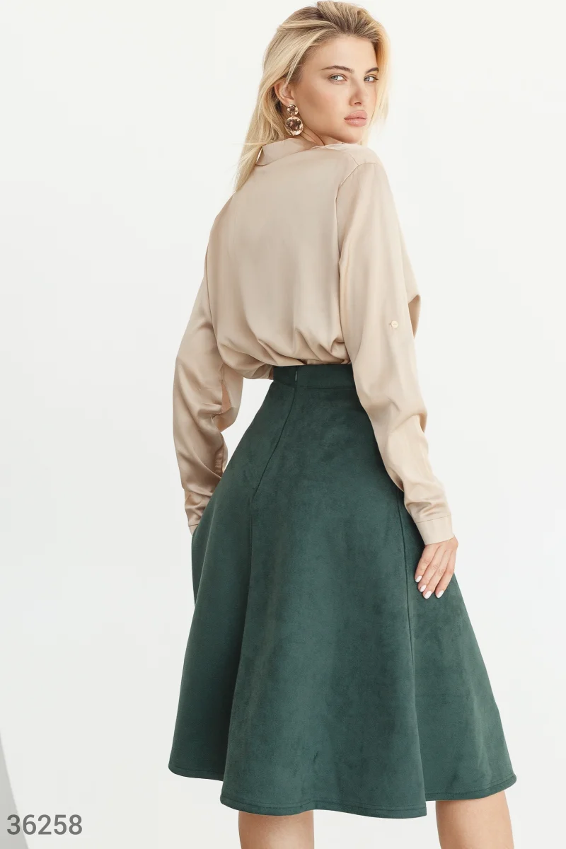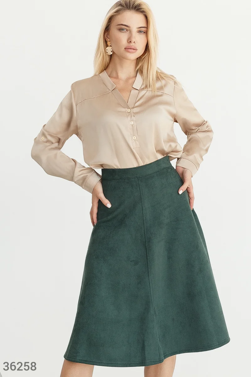 Юбка-миди зазвучала по-новому за счет материала. Для создания модели используется мягкая бархатистая замша. Фасон а-силуэта скрадывает излишний объем в бедрах, подчеркивает линию талии, зрительно удлиняет ноги и подходит к любому образу.