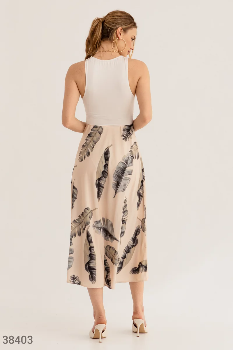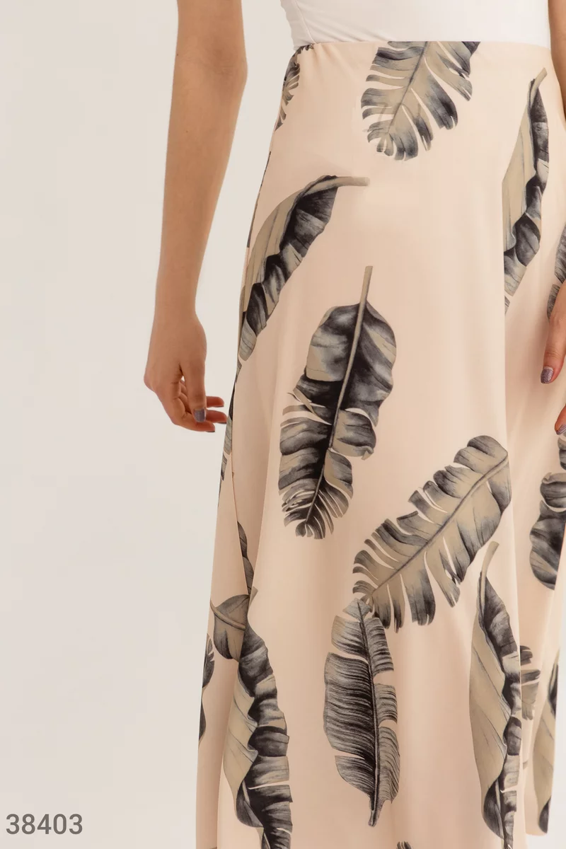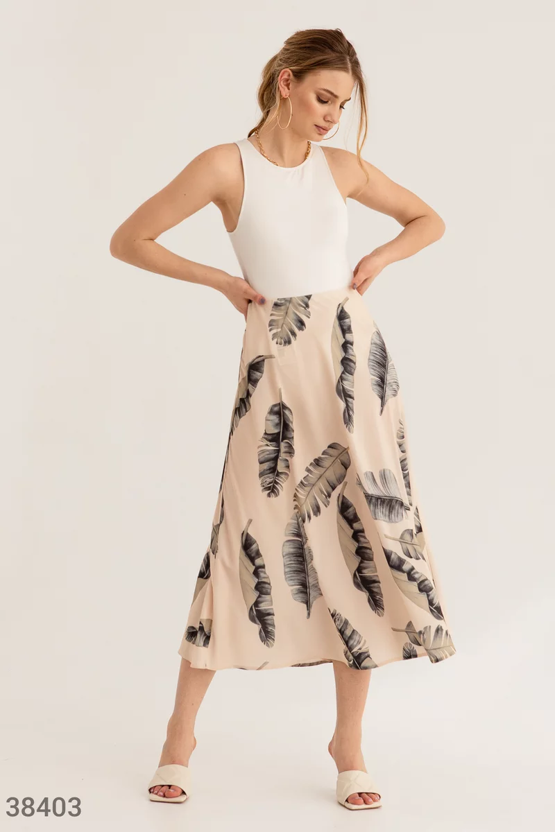 Юбка-миди выполнена из легкого скользящего материала и дополнена крупным принтом с тропическими листьями. В тандеме с атласным топом и босоножками на каблуке, модель создает женственный образ для летнего настроения.