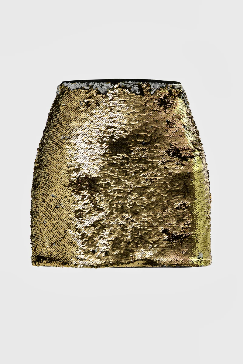 Эффектная юбка мини из сетчатого материала с паетками, создающими легкое мерцание. Застёгивается на скрытую молнию сбоку
