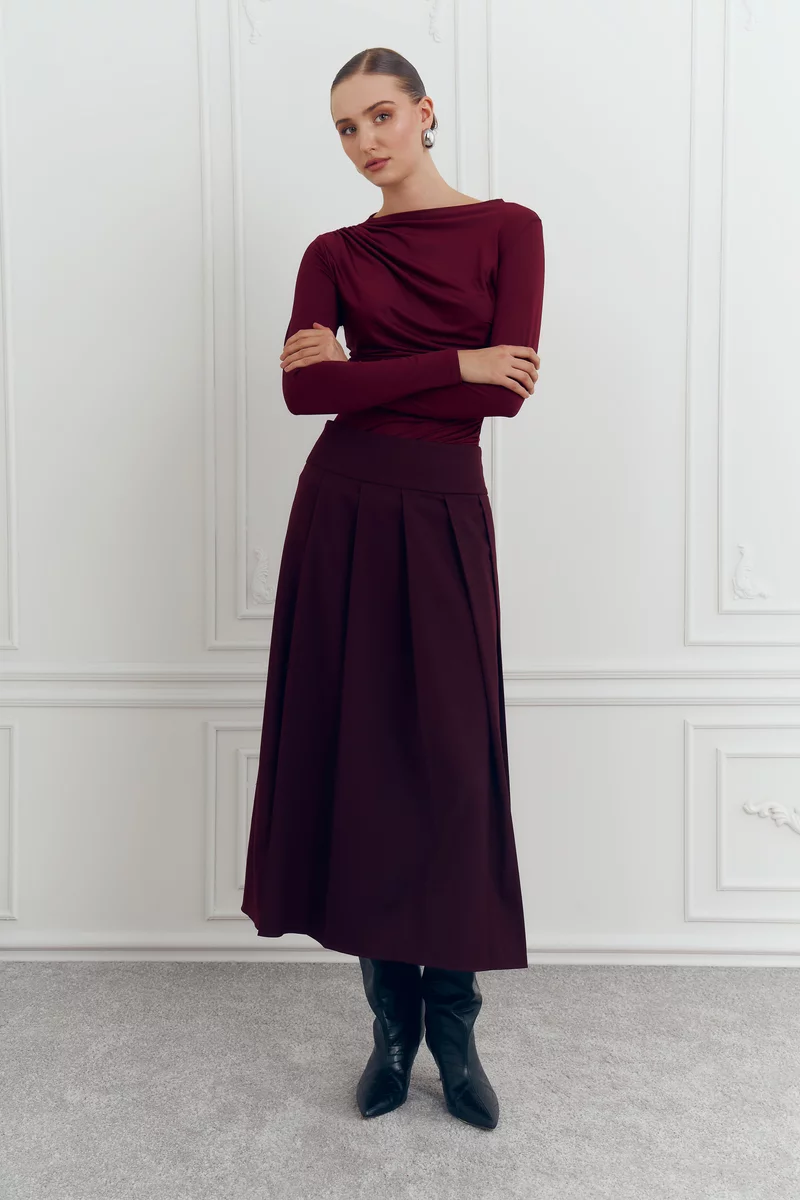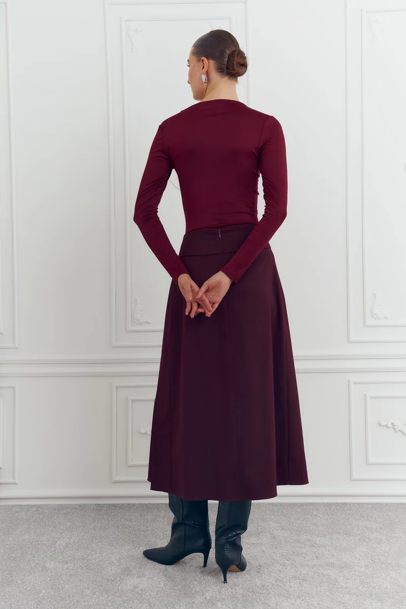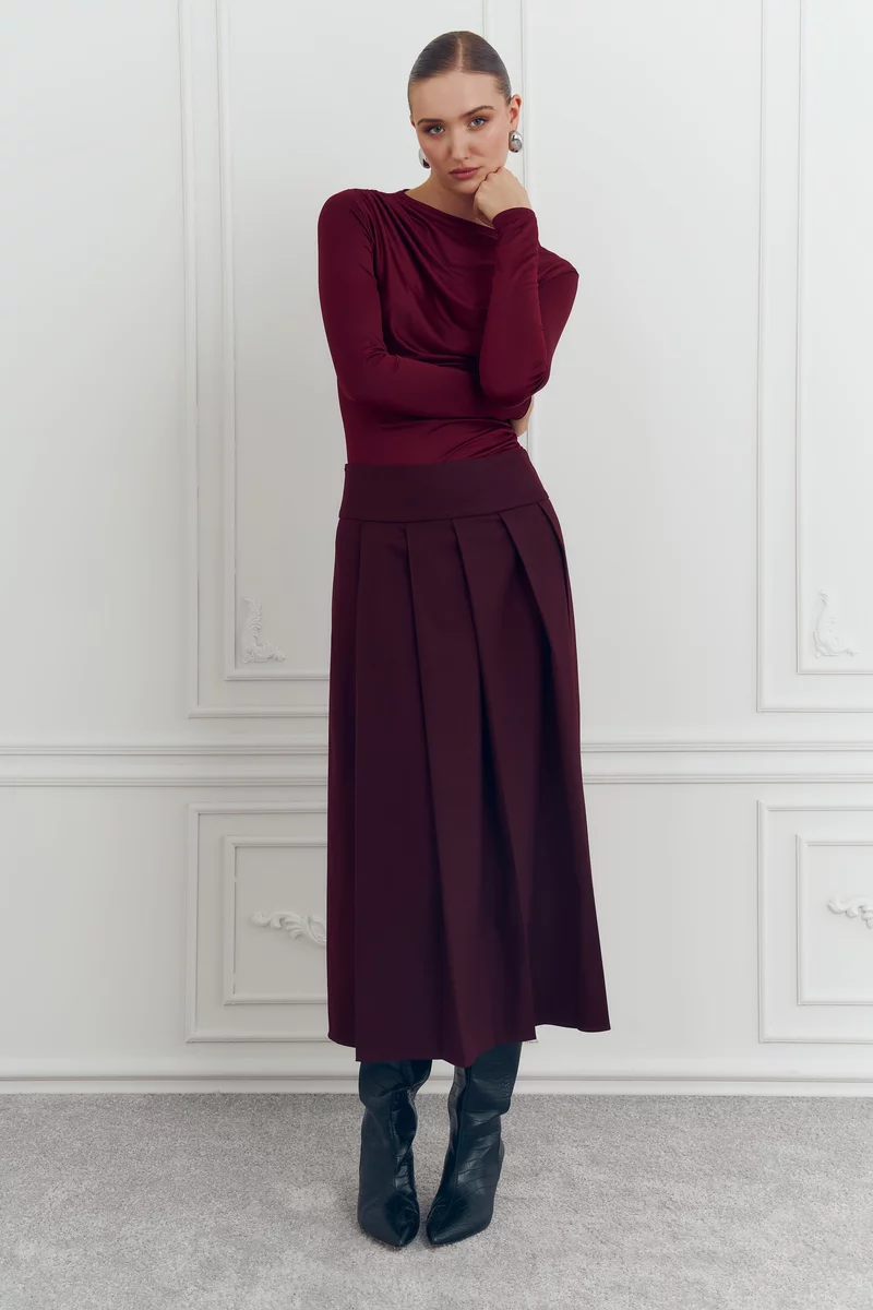Юбка миди из костюмной ткани с шерстью в составе. Модель расклешенного кроя с высокой талией, спереди со складками и разрезом. Застёгивается на скрытую молнию сзади