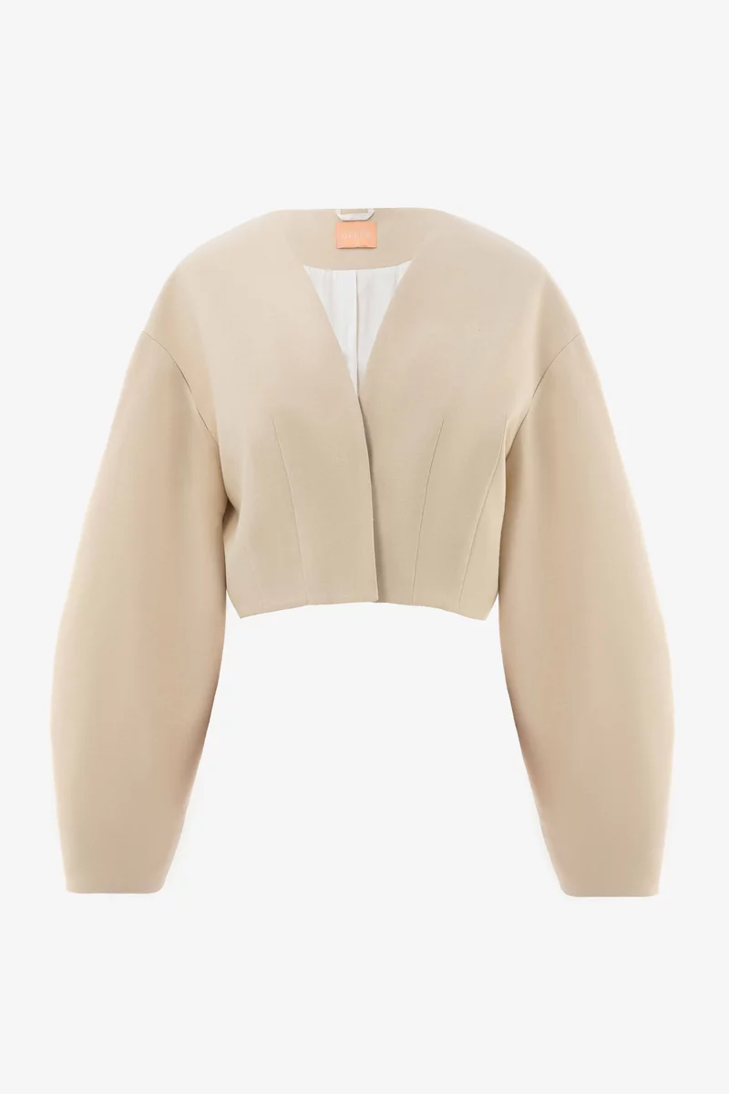 Укороченный жакет с акцентными объемными рукавами. Модель выполнена из костюмной ткани. Застёгивается на кнопку. На подкладке
