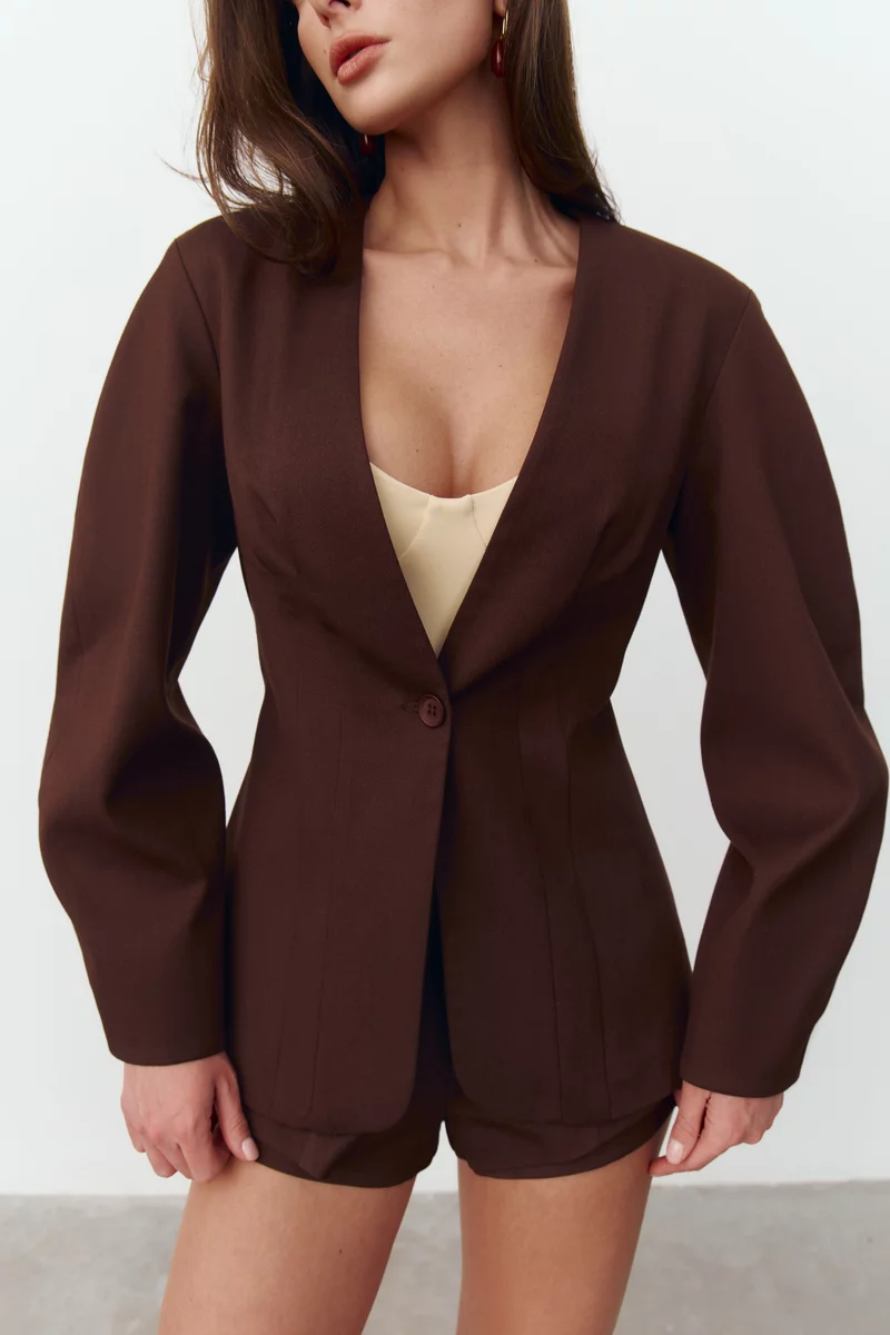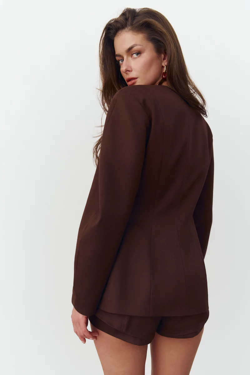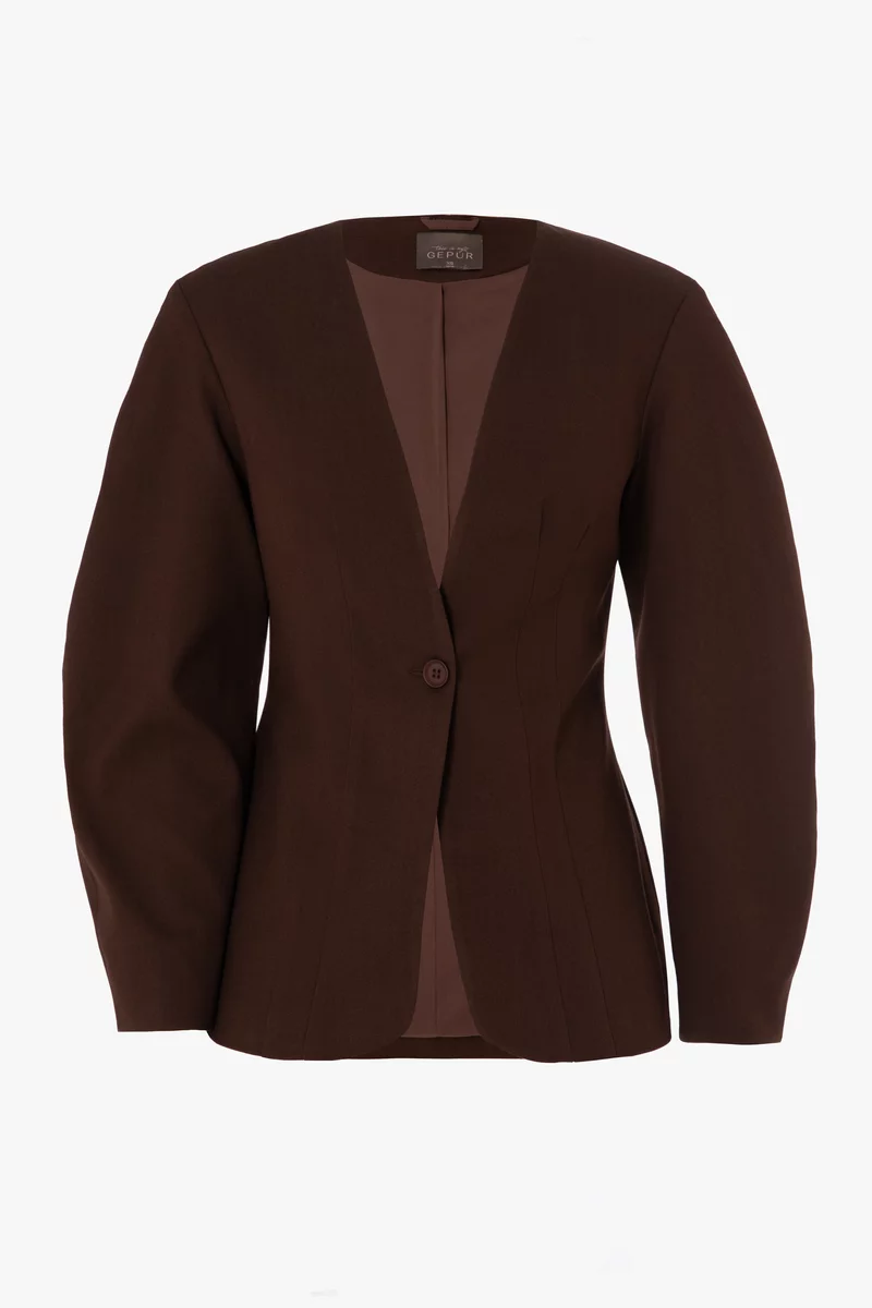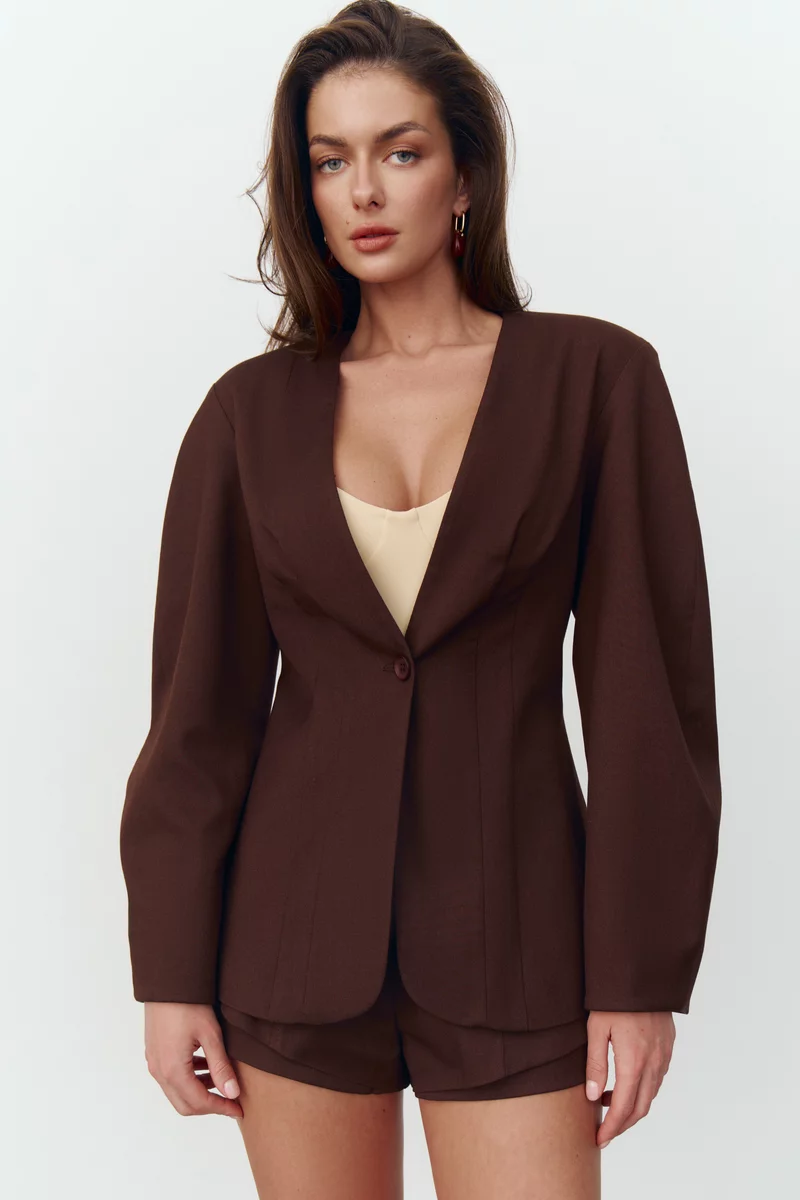 Базовый однобортный жакет из костюмной ткани. Застёгивается на пуговицы. В плечах предусмотрены дополнительные вставки для сохранения строгих линий. Модель с подчеркнутой талией и акцентными рукавами. На подкладке