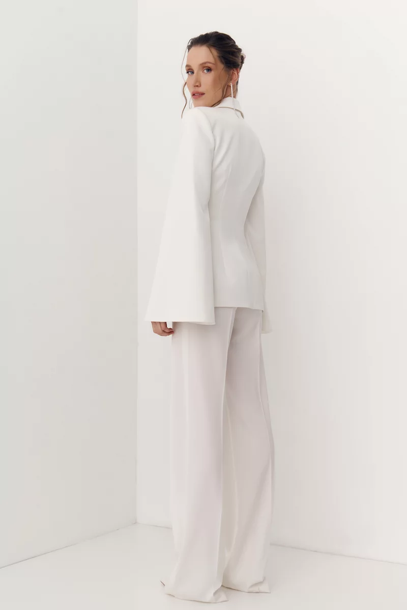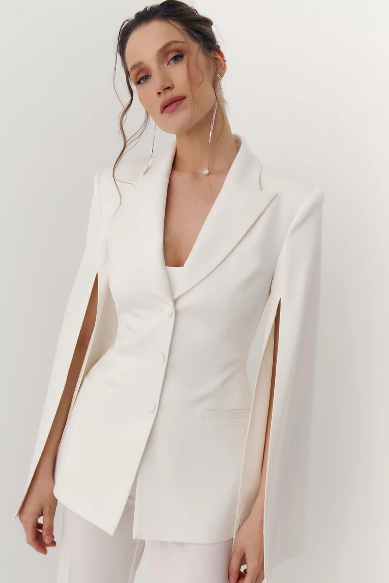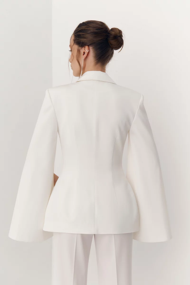 Молочный сатиновый однобортный жакет с акцентными рукавами
