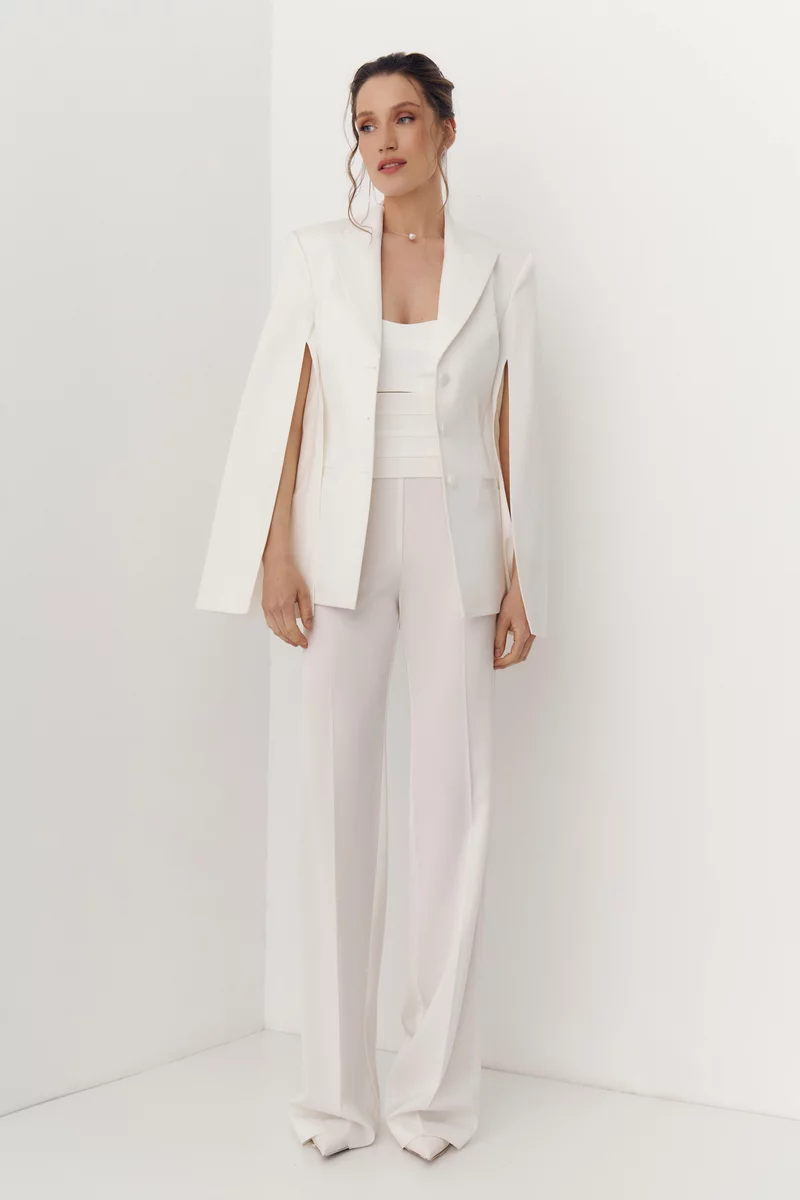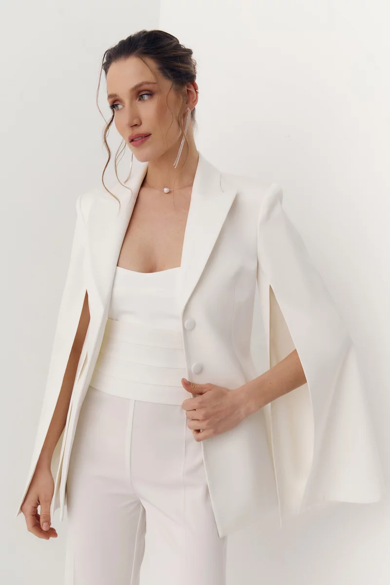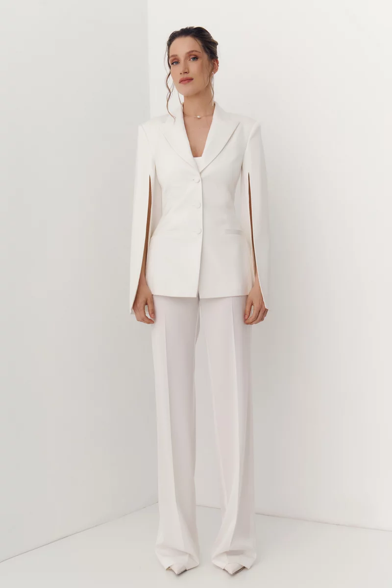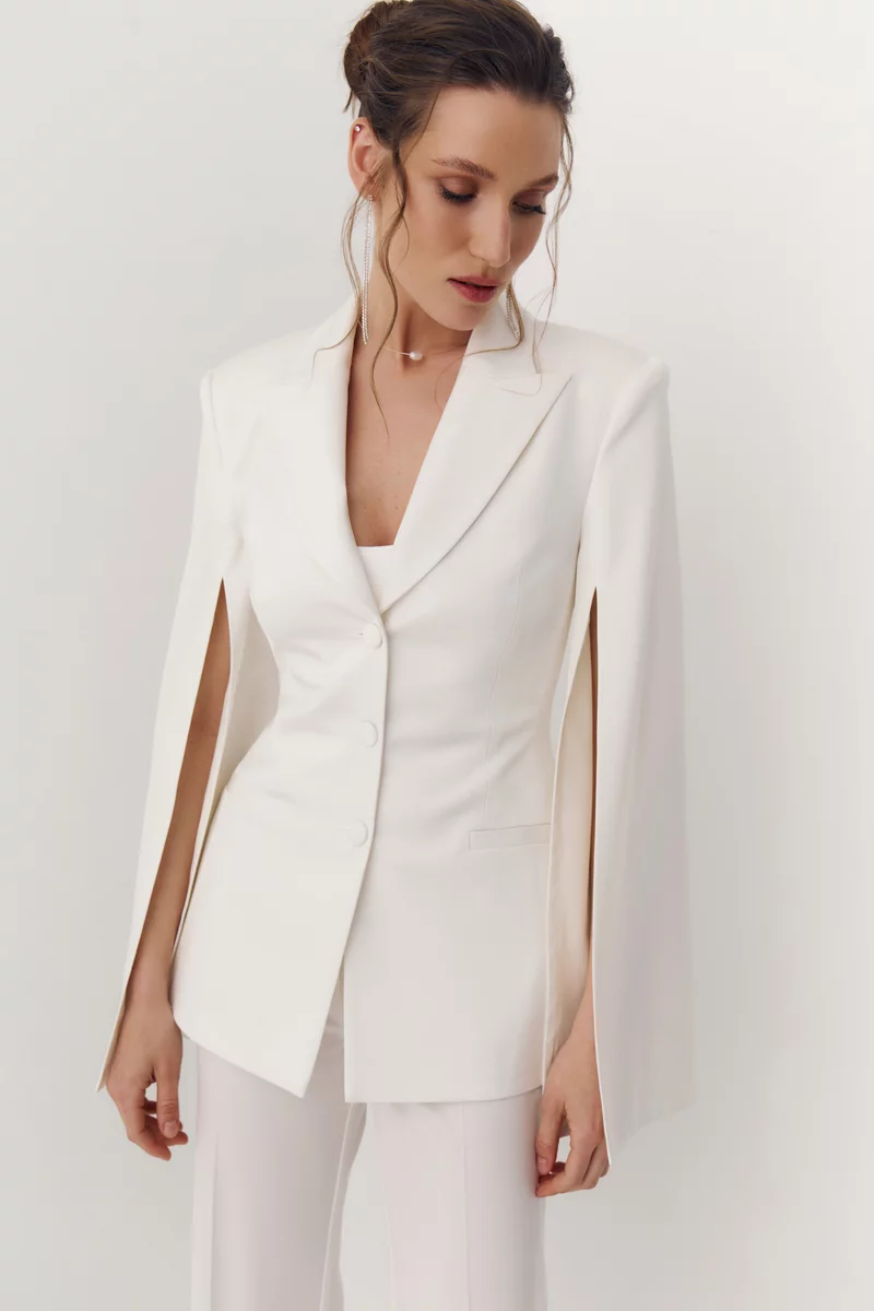 Молочный сатиновый однобортный жакет с акцентными рукавами