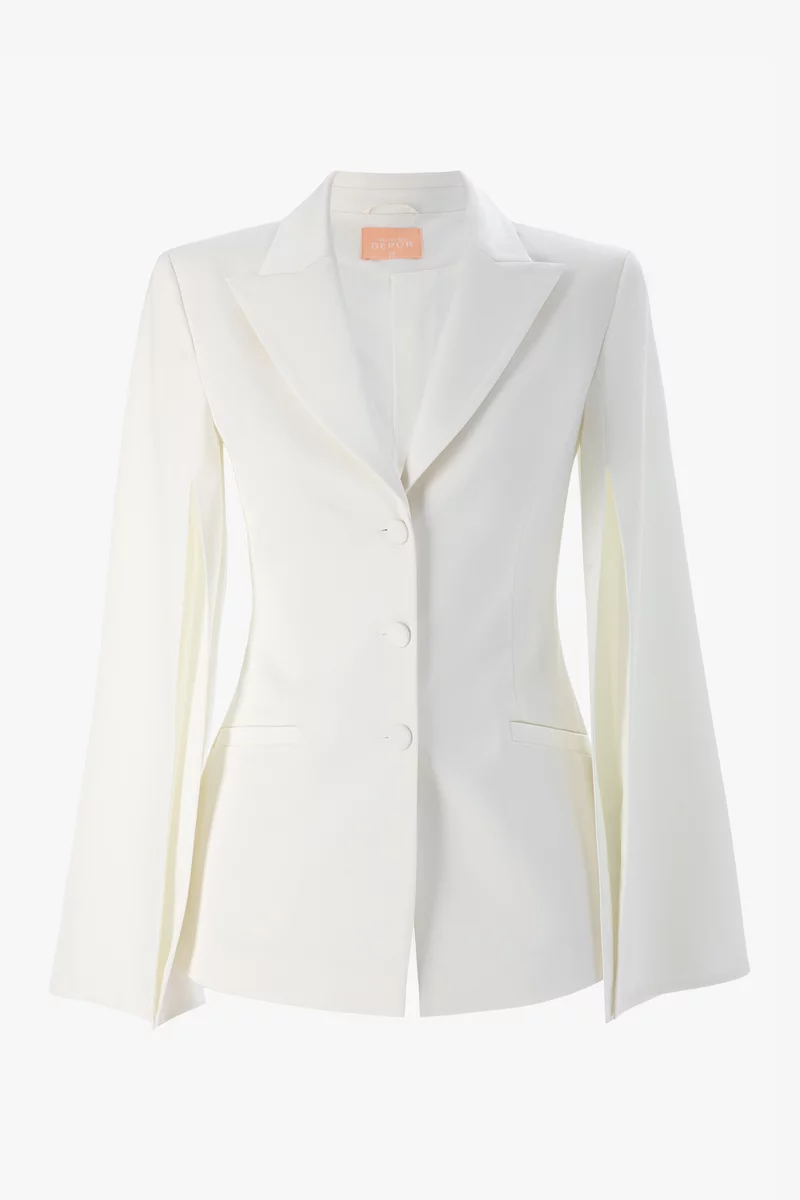 Сатиновый однобортный жакет с подчеркнутой талией и акцентными рукавами с разрезами. Застёгивается на пуговицы спереди. В плечах предусмотрены дополнительные вставки для сохранения строгих линий. На подкладке