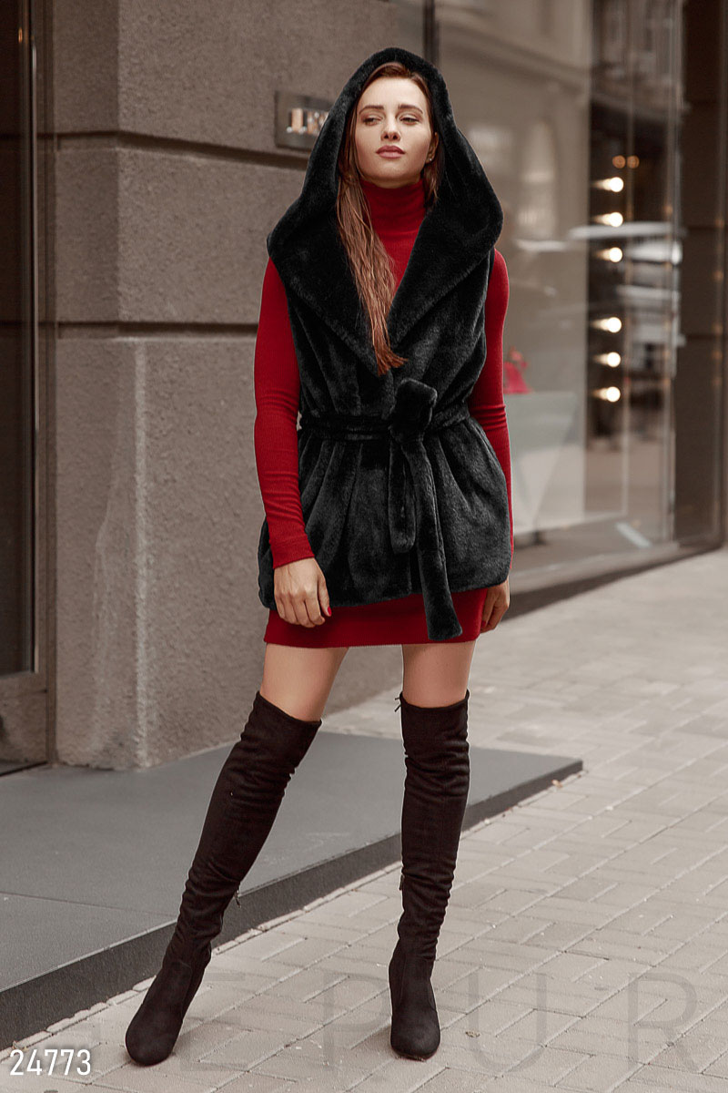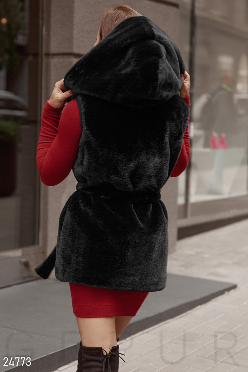 Теплый жилет прямого кроя, выполненный из мягкого эко-меха premium класса: удобный капюшон, два небольших кармана в швах и съемный пояс в тон.