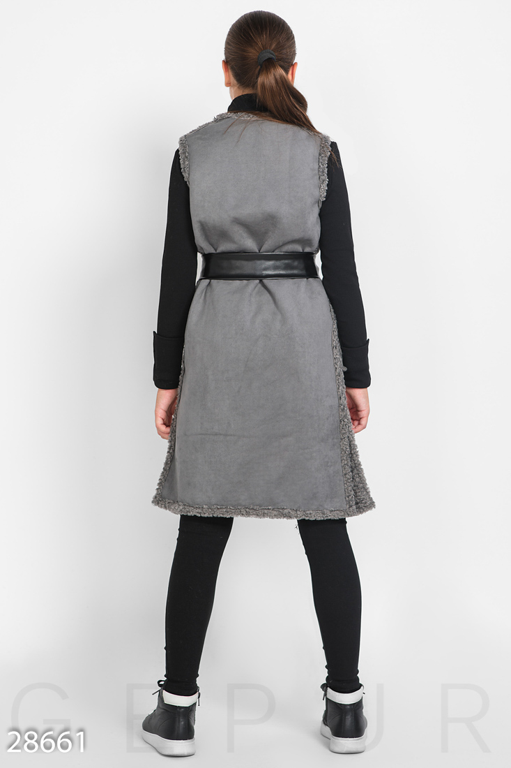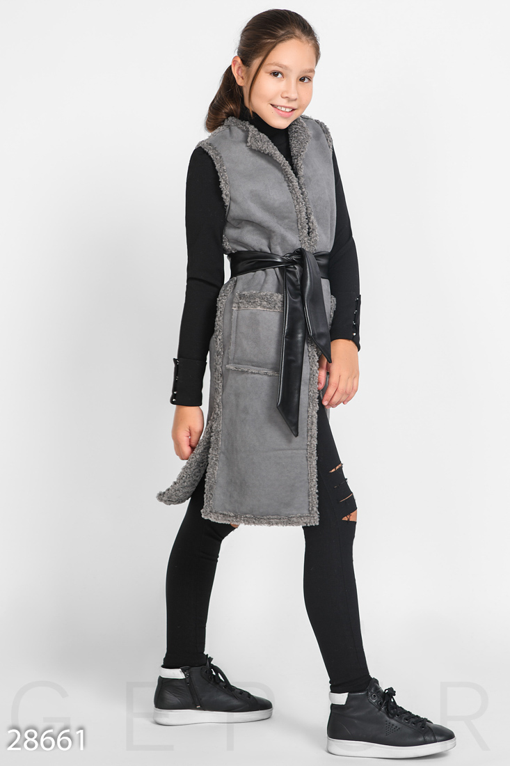Удлиненный детский жилет с карманами, выполненный из мягкой эко-замши с искусственным мехом. К жилету прилагается контрастный пояс из эко-кожи.