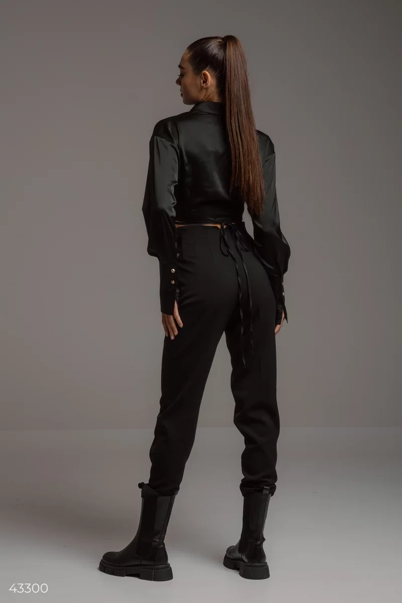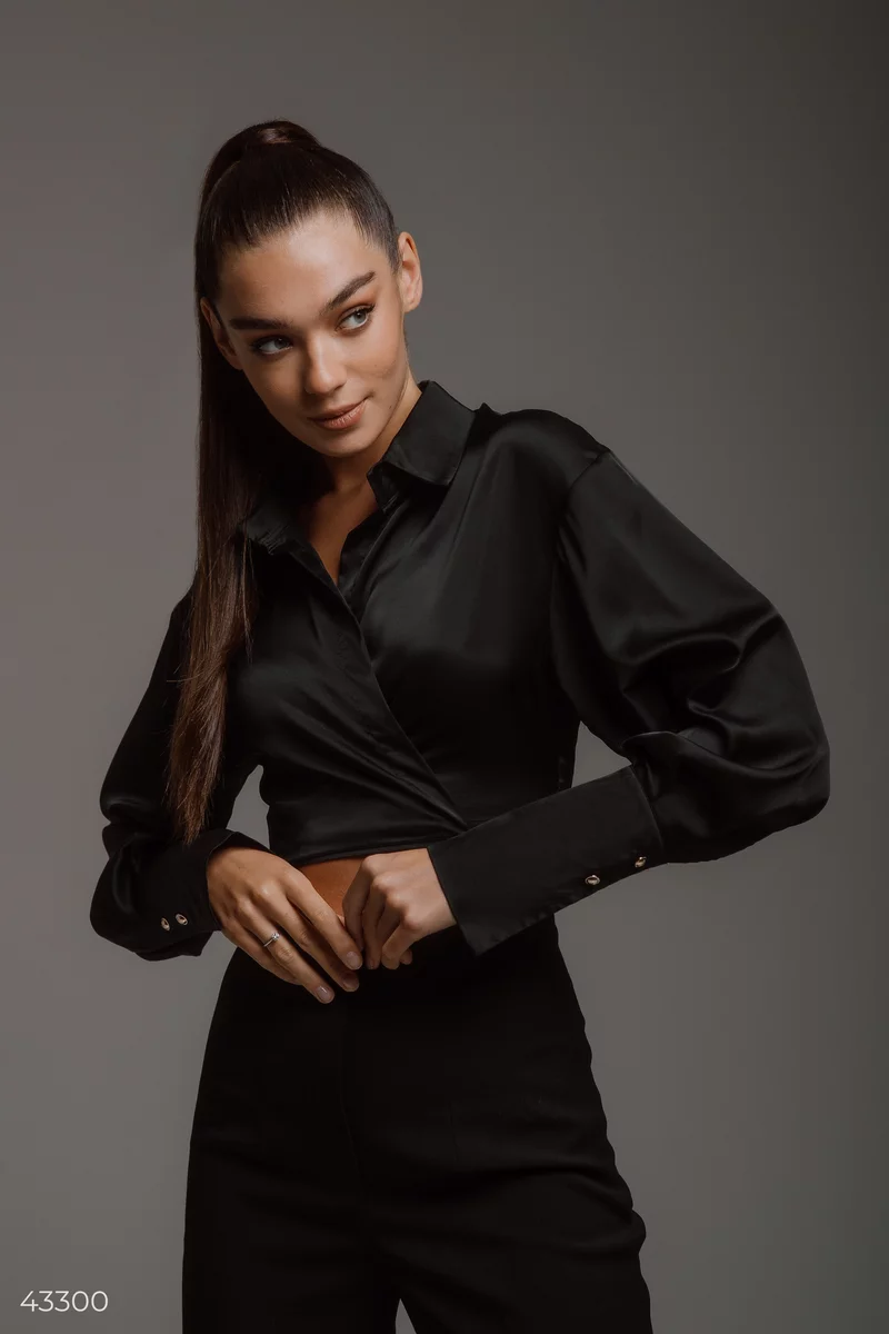 Укорочена блузка в чорному кольорі. Виконали з м'якого штучного шовку. Оригінальний крій блузи підкреслює зону декольте. Акуратний комір, подовжений рукав з акцентними манжетами і довгі зав'язки на запах. Блузу можна комбінувати, як із класичними брюками, так і джинсами.