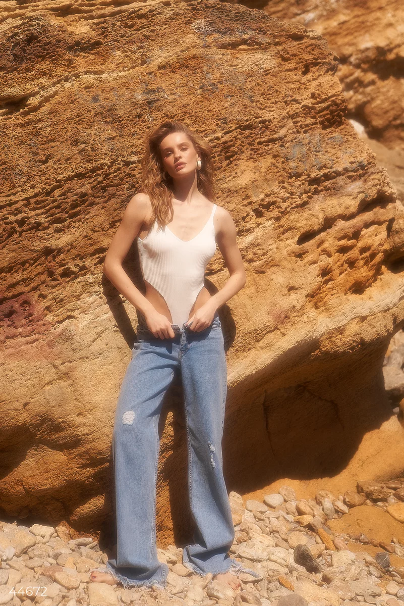 Білий боді з вирізами – акцентна річ у гардеробі. Тонкий та легкий трикотаж комфортно облягає силует. Можна надіти з жакетом для повсякденного образу або стилізувати на вечір з джинсами або для побачення зі спідницею. Виконали з м'якого та тонкого трикотажу. Застібка на ластівці на дві акуратні кнопки.