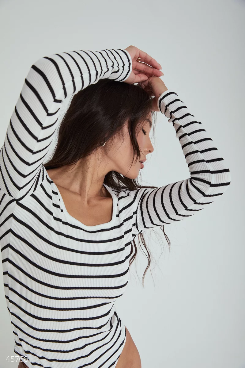 Боді облягаюче в смужку з фактурного трикотажу. Модель відрізняється глибоким круглим вирізом на грудях, довгим рукавом, що облягає. Боді застібається на кнопки. Є можливість регулювати довжину.