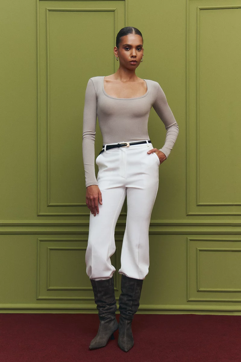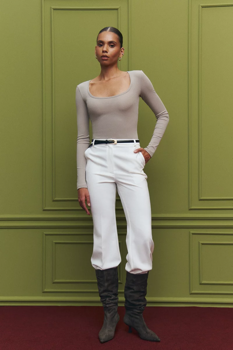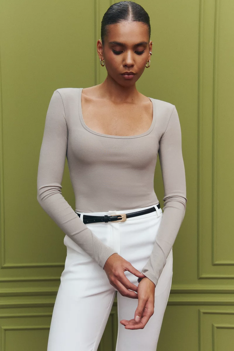 Облягаючий боді з довгим рукавом із приємної до тіла трикотажної тканини. Базова модель з акцентним круглим вирізом. Застібається на кнопки