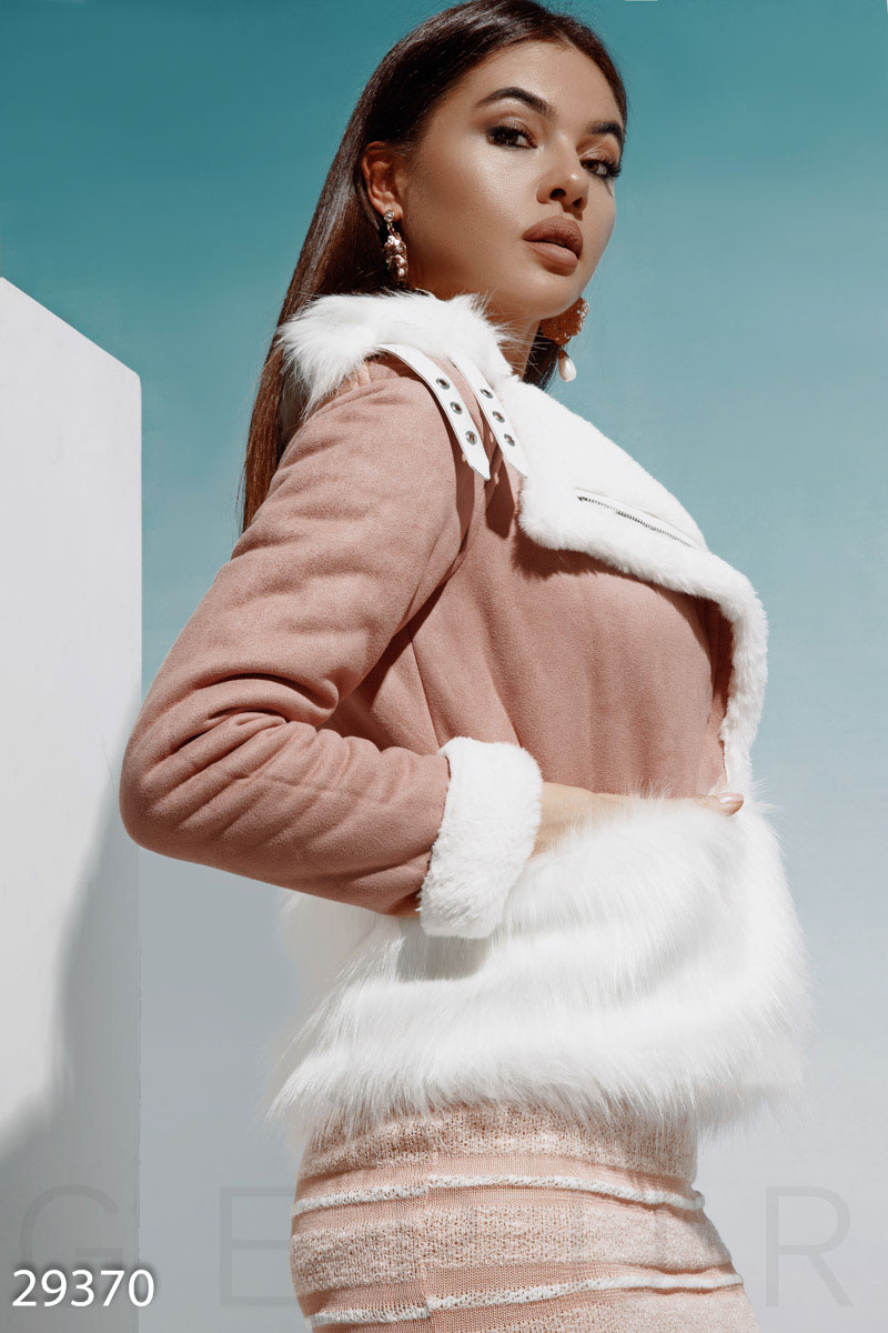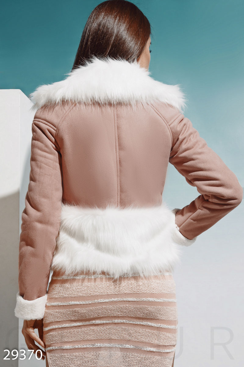 Легка дублянка в стилі aviator, виготовлена з м'якої еко-шкіри premium класу: хутряний комір із застібкою, довгий рукав з необробленими краями та асиметрична застібка на блискавку.