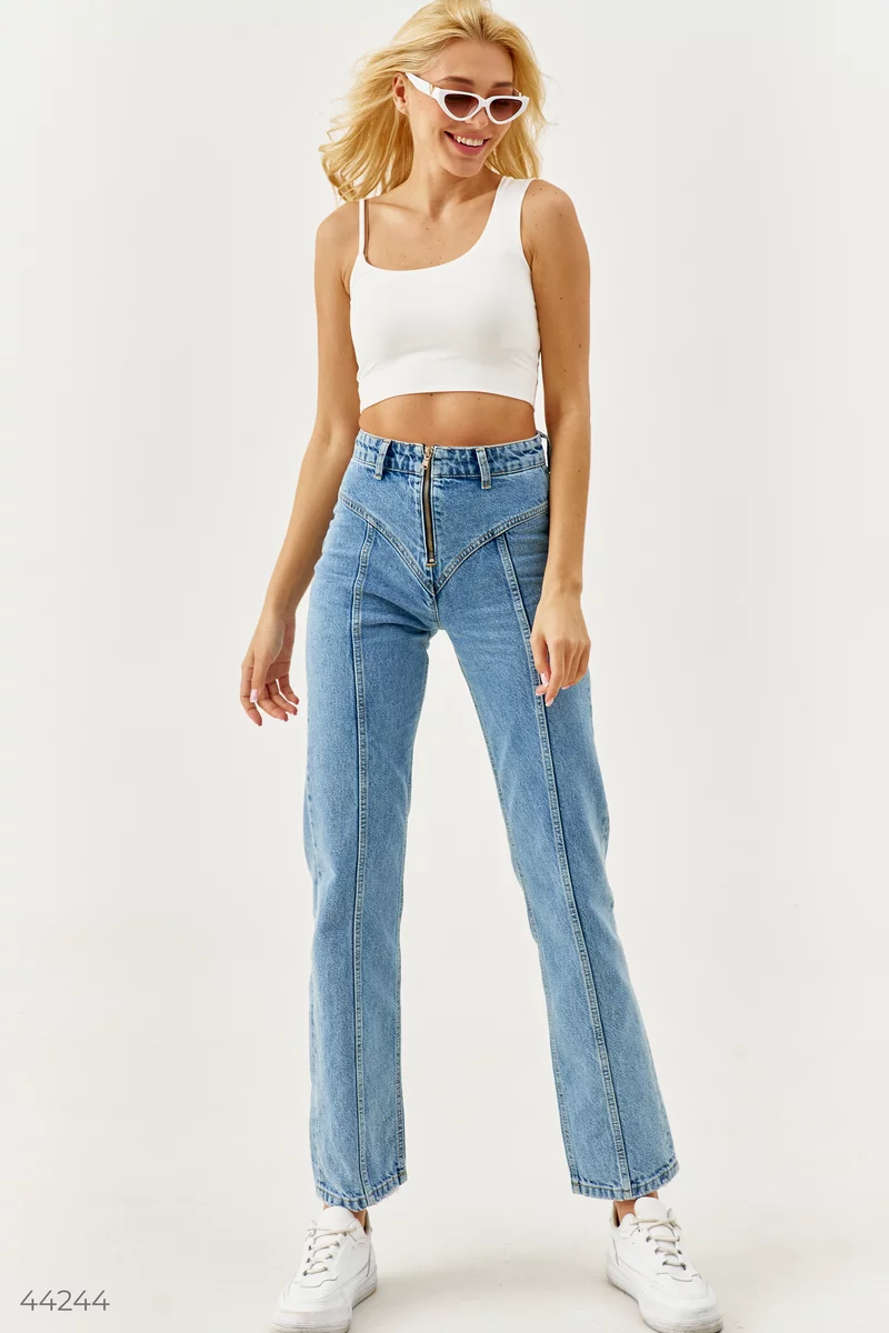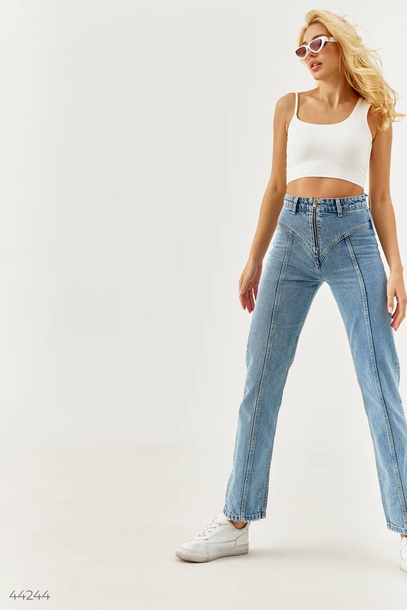 Злегка вкорочені та звужені донизу джинси зі 100% бавовни. Універсальний сині джинси з комфортною високою посадкою та металевою блискавкою спереду щільно прилягають та підкреслюють стрункість ніг. Завдяки текстурі деніму ефект варіння на такій моделі виглядає гармонійно.