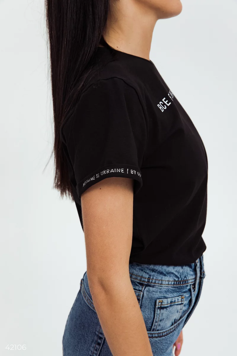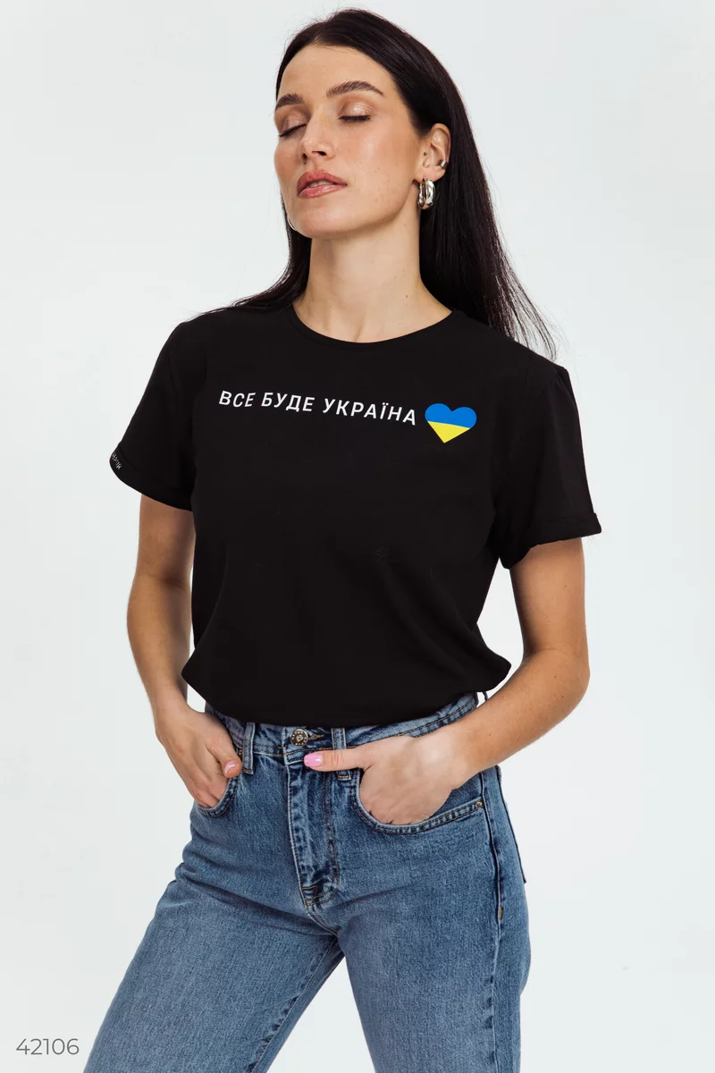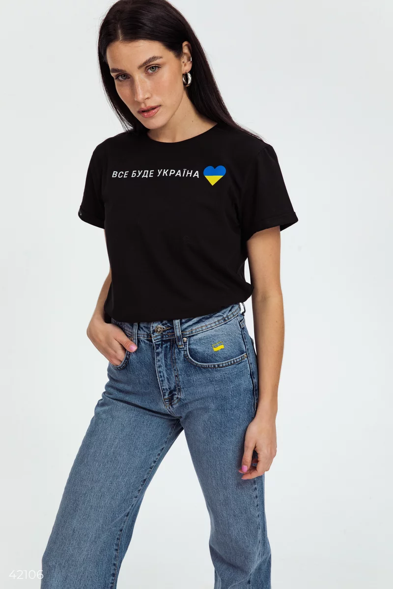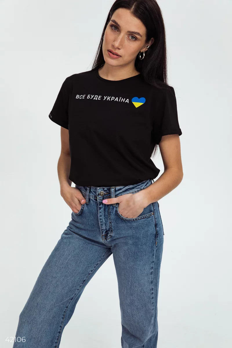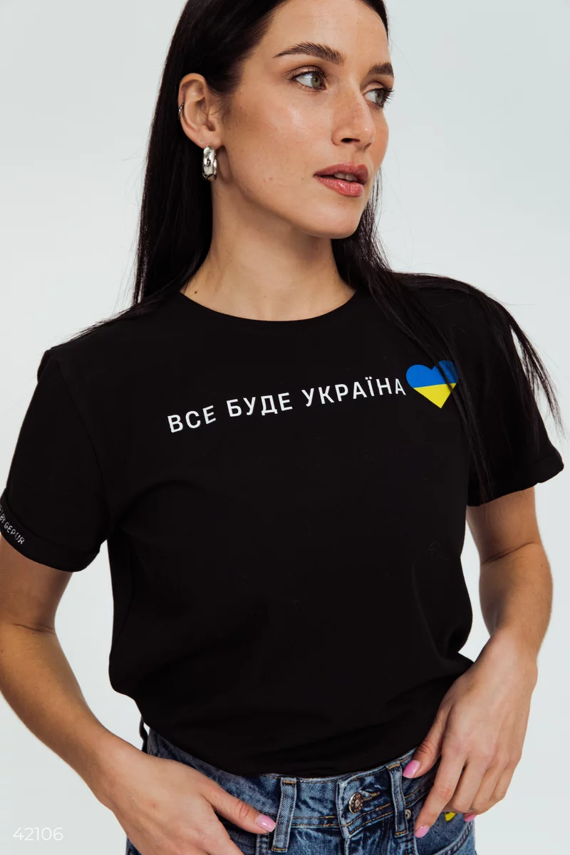 Базова чорна футболка з українським принтом "Все буде Україна". Модель доповнена фіксованими виворотами на рукавах.
