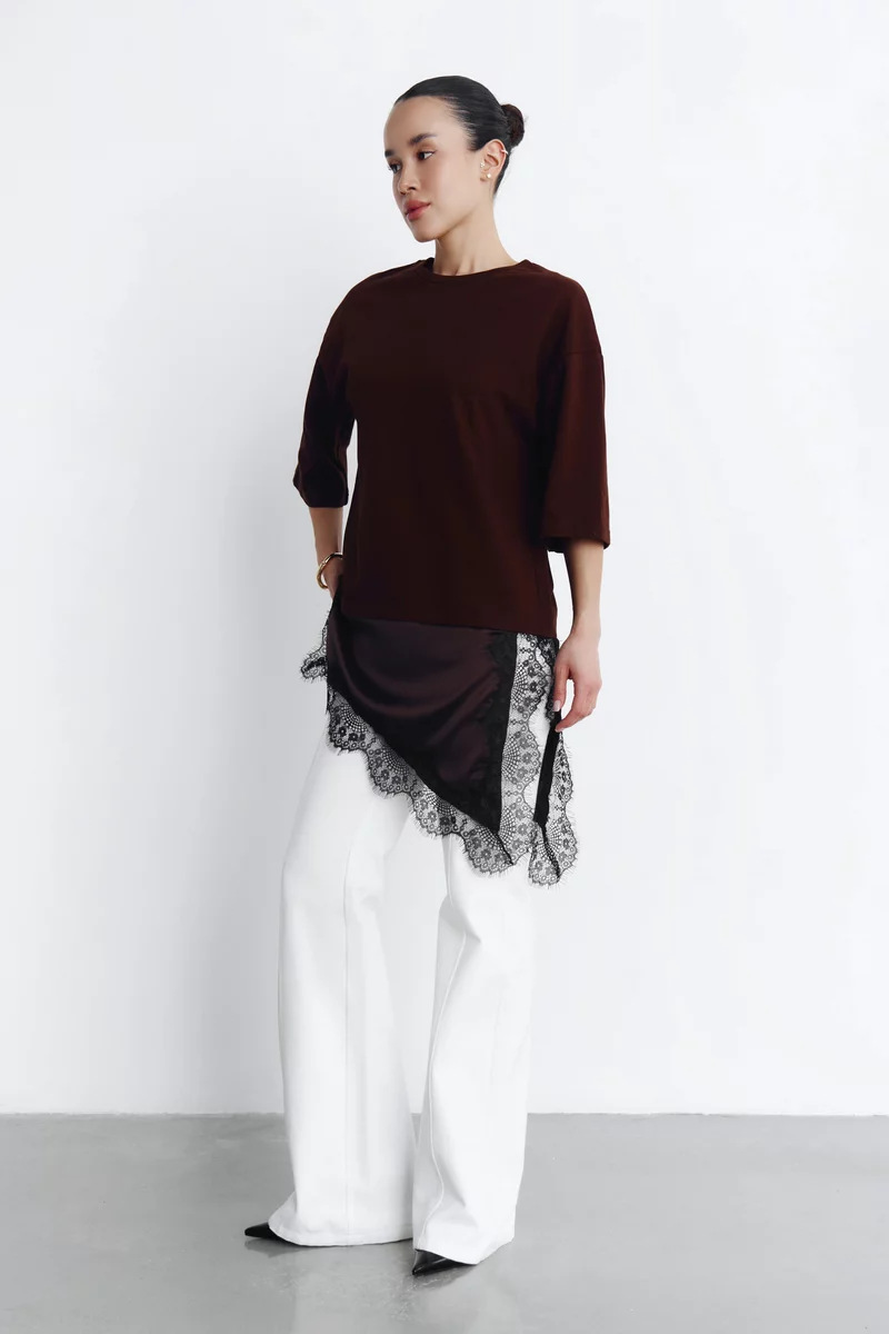 Футболка оверсайз асиметричного крою зі 100% бавовни. Акцентна деталь - мереживна вставка. Занижена лінія плеча та круглий виріз